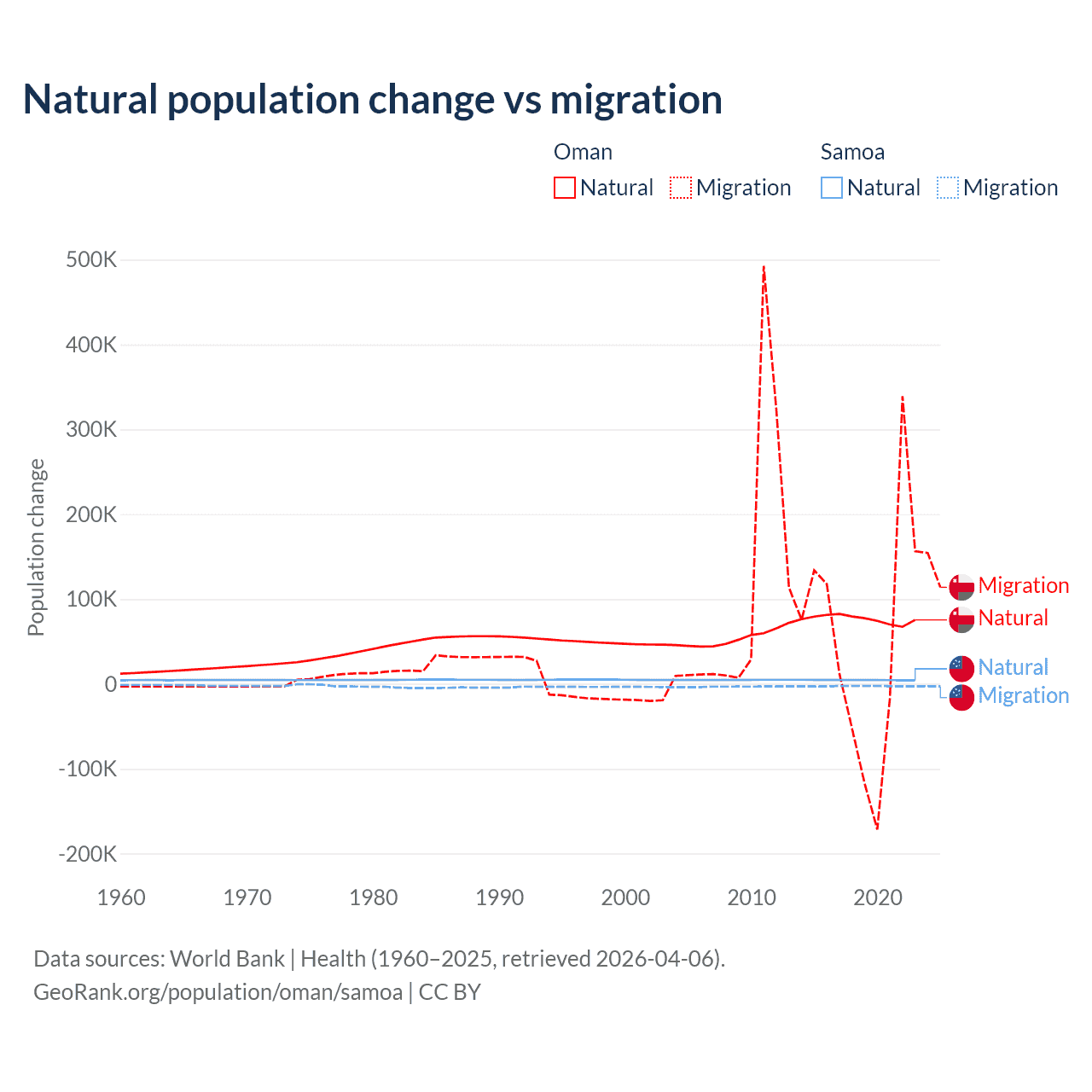 Over the last 10 years, 61.6% of the population change in Oman is from natural causes (a gain of 763,049 people) and 38.4% is from migration (a gain of 475,565 people). In Samoa 62.5% is from natural causes (a gain of 45,436 people) and 37.5% is from migration (a loss of 27,246 people).