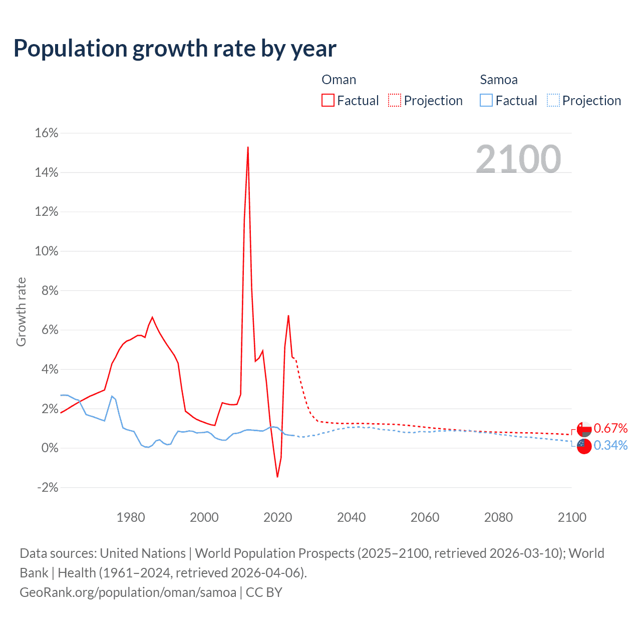 - For the last 10 years, Oman has had an average growth rate of +2.99% per year vs +0.87% in Samoa.