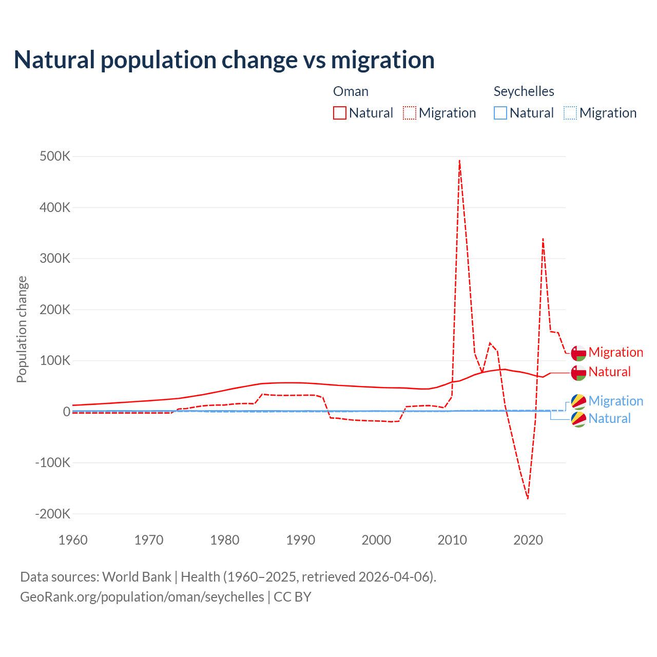 Over the last 10 years, 61.6% of the population change in Oman is from natural causes (a gain of 763,049 people) and 38.4% is from migration (a gain of 475,565 people). In the Seychelles 31.4% is from natural causes (a gain of 8,122 people) and 68.6% is from migration (a gain of 17,748 people).