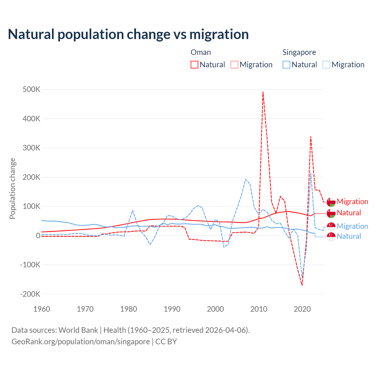 Over the last 10 years, 61.6% of the population change in Oman is from natural causes (a gain of 763,049 people) and 38.4% is from migration (a gain of 475,565 people). In Singapore 54.8% is from natural causes (a gain of 195,953 people) and 45.2% is from migration (a gain of 161,805 people).