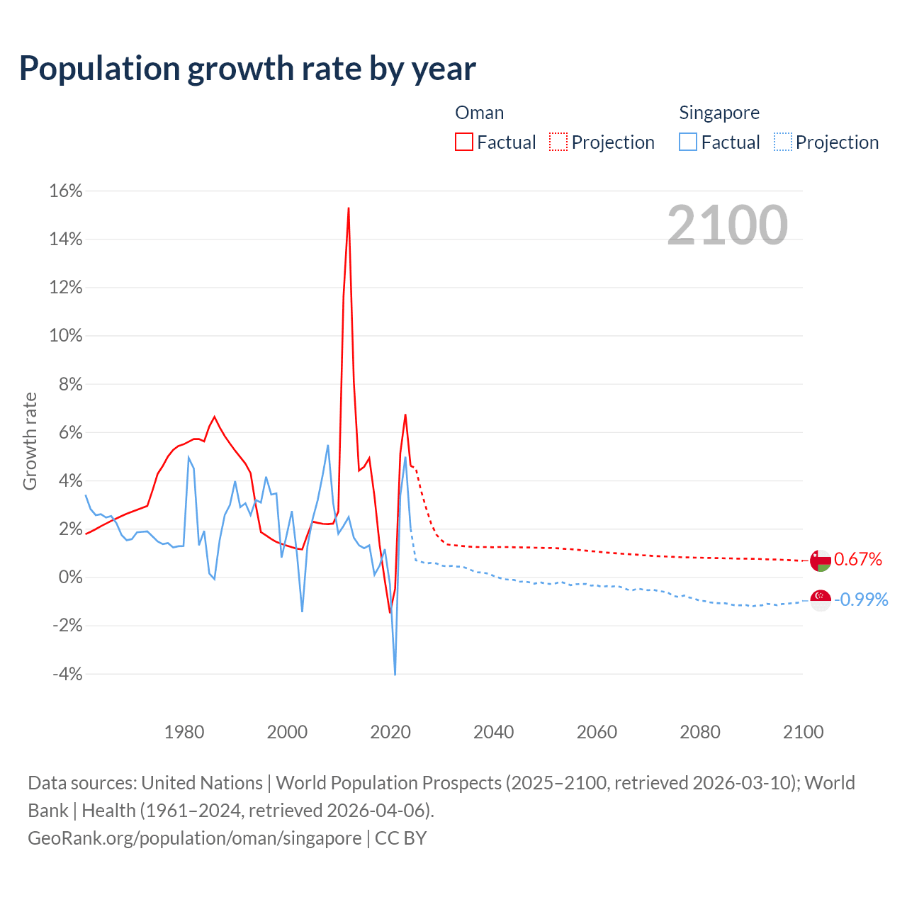 - For the last 10 years, Oman has had an average growth rate of +2.99% per year vs +1.04% in Singapore.