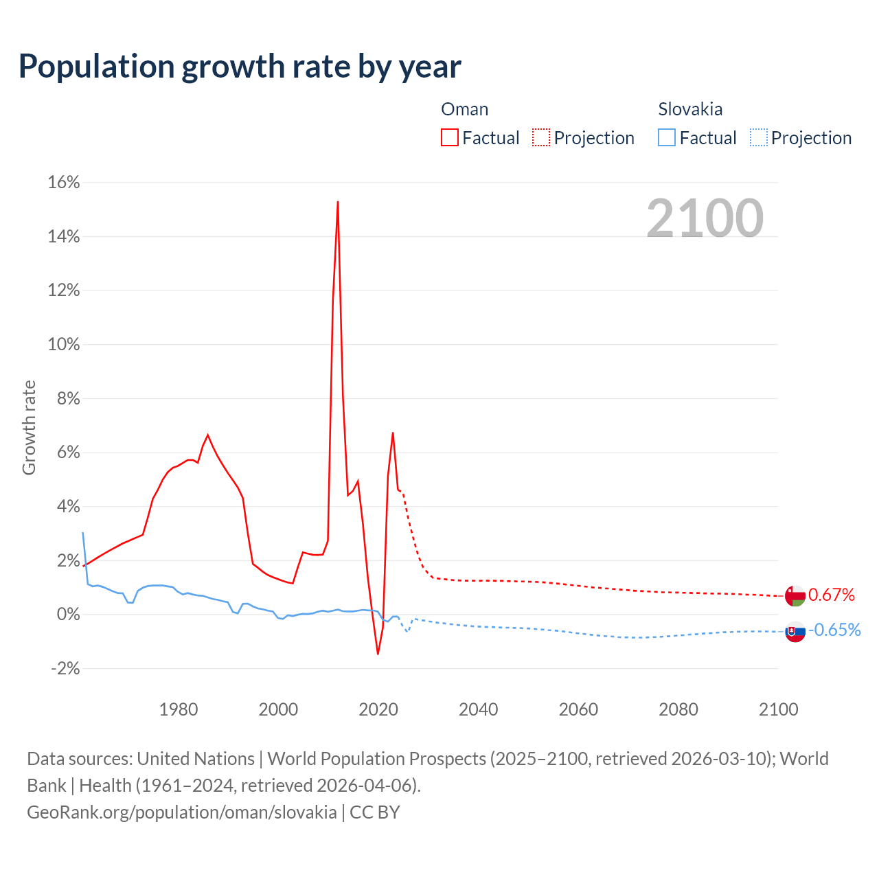 - For the last 10 years, Oman has had an average growth rate of +2.99% per year vs +0.01% in Slovakia.