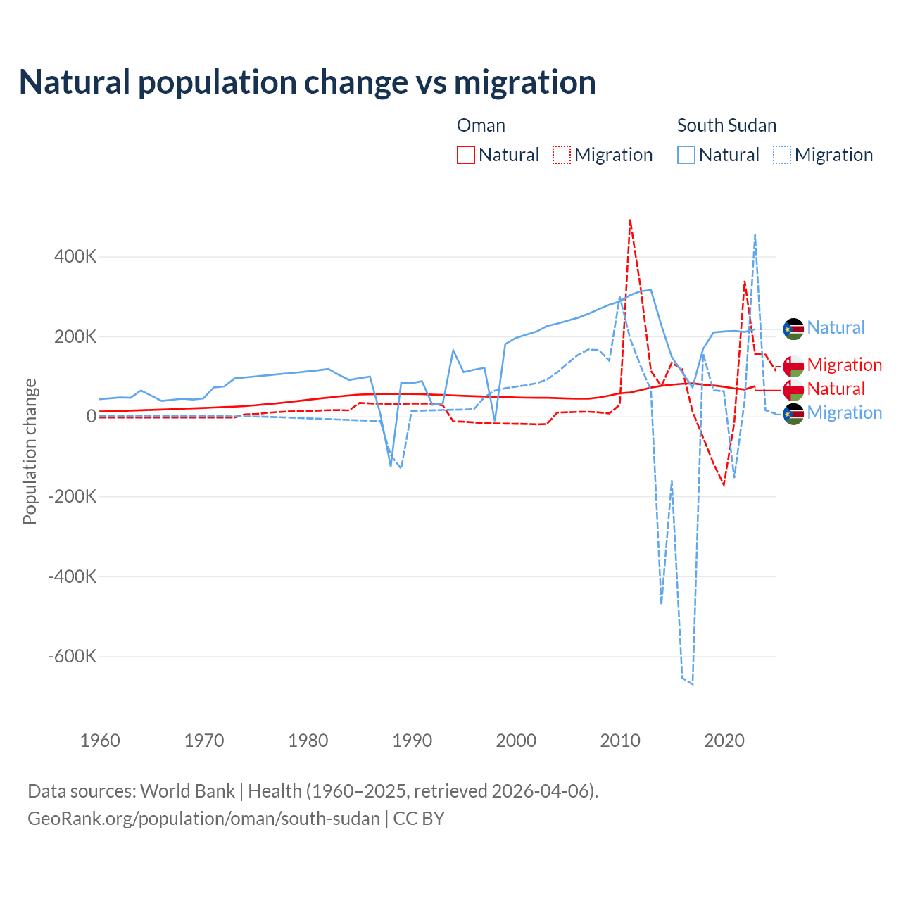 Over the last 10 years, 61.6% of the population change in Oman is from natural causes (a gain of 763,049 people) and 38.4% is from migration (a gain of 475,565 people). In South Sudan 57.4% is from natural causes (a gain of 1,792,135 people) and 42.6% is from migration (a loss of 1,329,606 people).