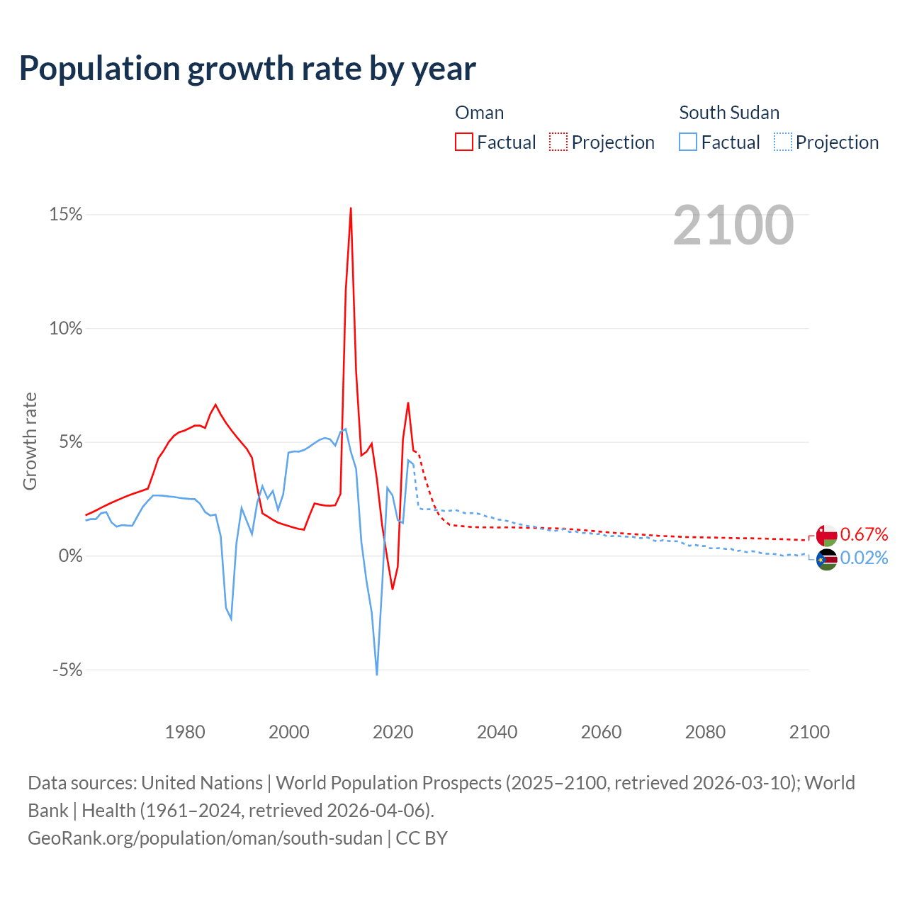 - For the last 10 years, Oman has had an average growth rate of +2.99% per year vs +0.65% in South Sudan.