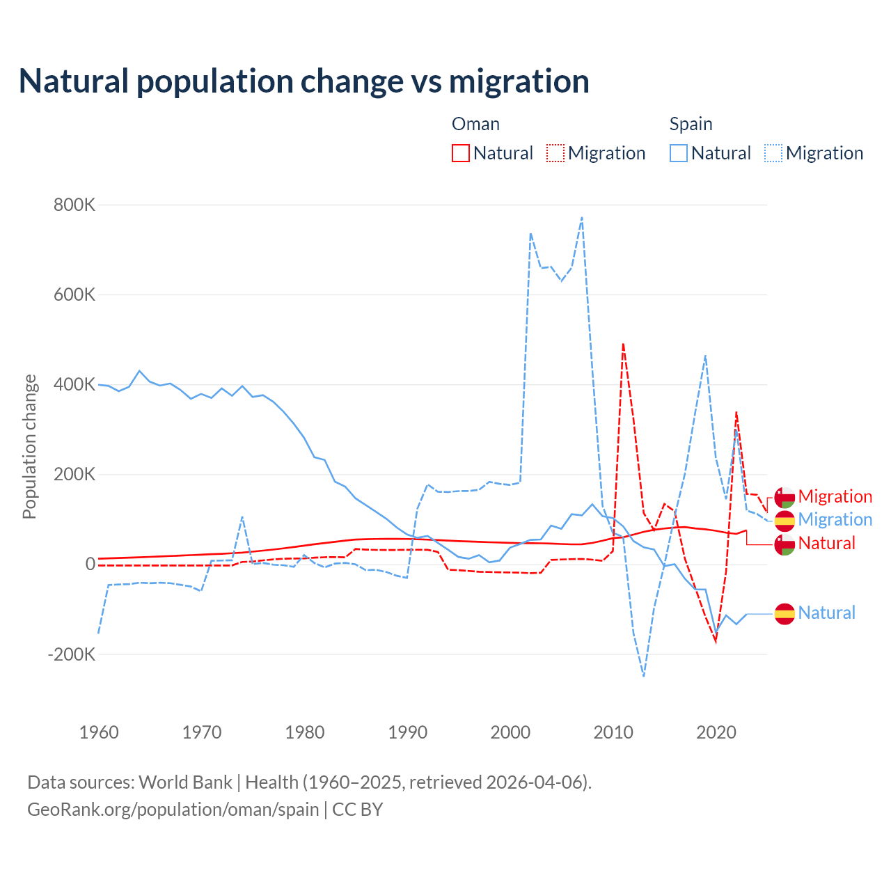Over the last 10 years, 61.6% of the population change in Oman is from natural causes (a gain of 763,049 people) and 38.4% is from migration (a gain of 475,565 people). In Spain 25.8% is from natural causes (a loss of 627,829 people) and 74.2% is from migration (a gain of 1,810,127 people).
