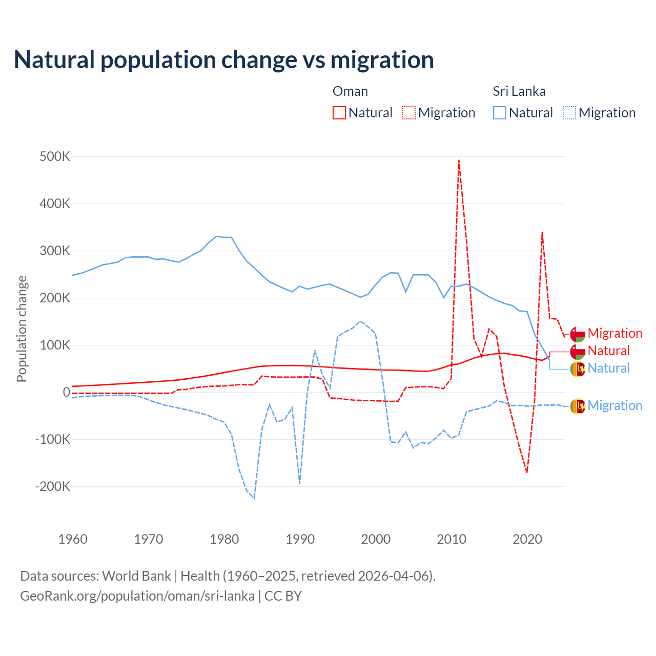 Over the last 10 years, 61.6% of the population change in Oman is from natural causes (a gain of 763,049 people) and 38.4% is from migration (a gain of 475,565 people). In Sri Lanka 85.3% is from natural causes (a gain of 1,605,749 people) and 14.7% is from migration (a loss of 276,121 people).