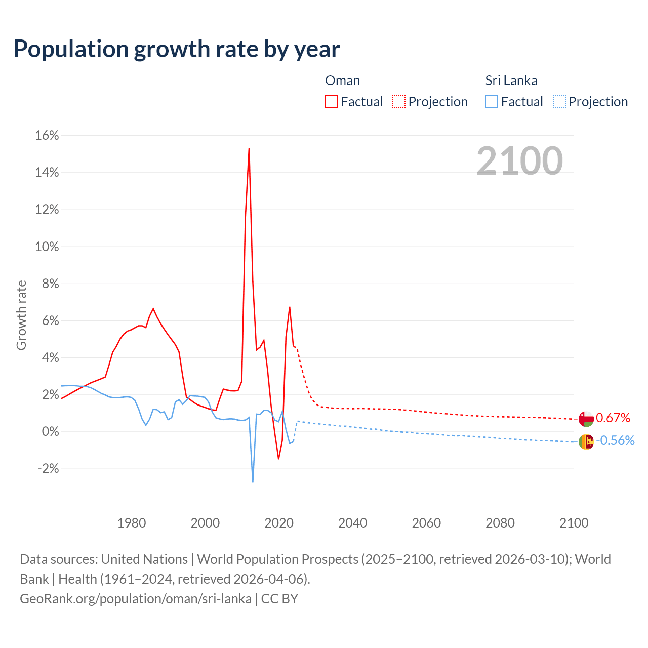- For the last 10 years, Oman has had an average growth rate of +2.99% per year vs +0.57% in Sri Lanka.