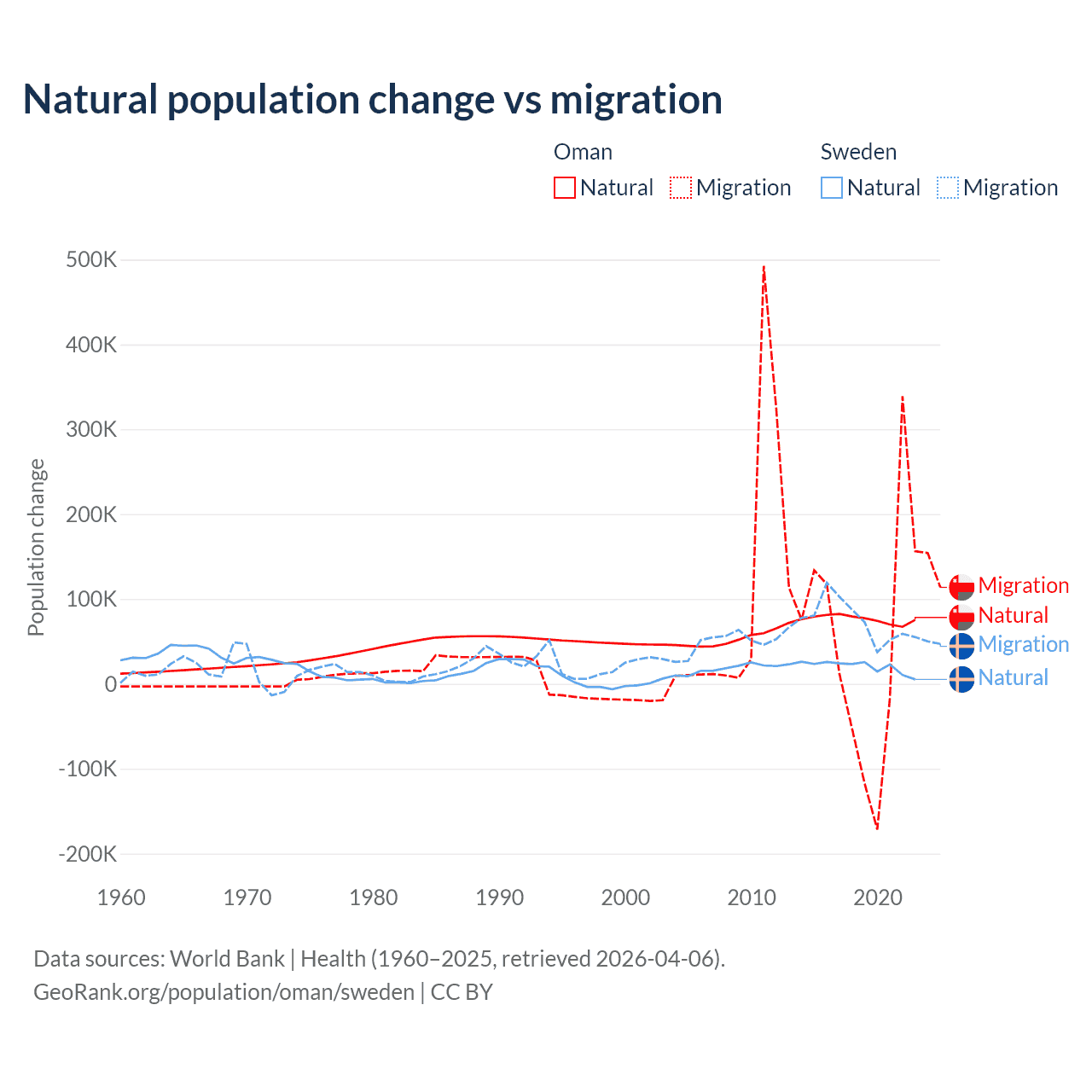 Over the last 10 years, 61.6% of the population change in Oman is from natural causes (a gain of 763,049 people) and 38.4% is from migration (a gain of 475,565 people). In Sweden 21.4% is from natural causes (a gain of 201,900 people) and 78.6% is from migration (a gain of 743,642 people).