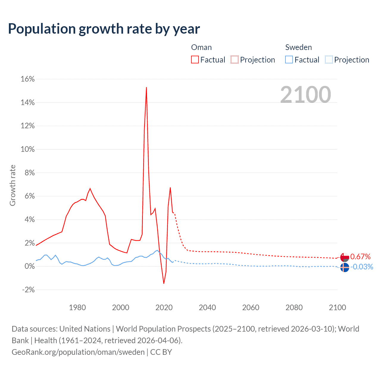 - For the last 10 years, Oman has had an average growth rate of +2.99% per year vs +0.88% in Sweden.