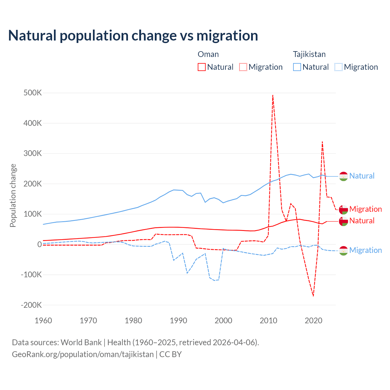 Over the last 10 years, 61.6% of the population change in Oman is from natural causes (a gain of 763,049 people) and 38.4% is from migration (a gain of 475,565 people). In Tajikistan 96% is from natural causes (a gain of 2,266,045 people) and 3.95% is from migration (a loss of 93,205 people).