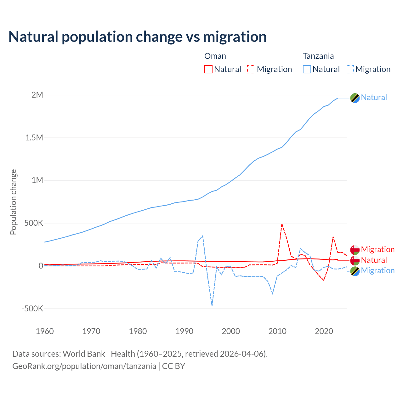 Over the last 10 years, 61.6% of the population change in Oman is from natural causes (a gain of 763,049 people) and 38.4% is from migration (a gain of 475,565 people). In Tanzania 98.7% is from natural causes (a gain of 17,769,541 people) and 1.27% is from migration (a gain of 229,466 people).