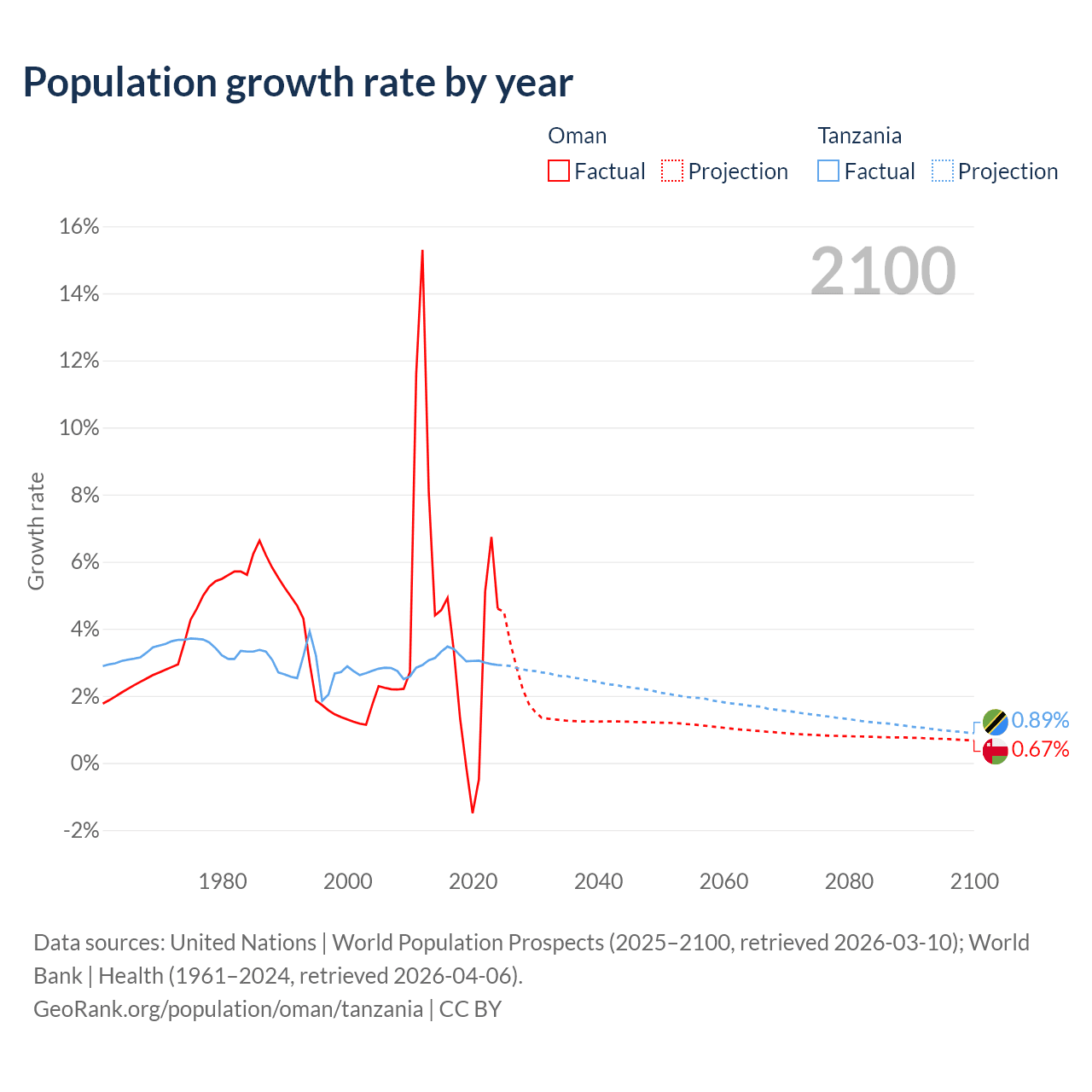 - For the last 10 years, Oman has had an average growth rate of +2.99% per year vs +3.13% in Tanzania.