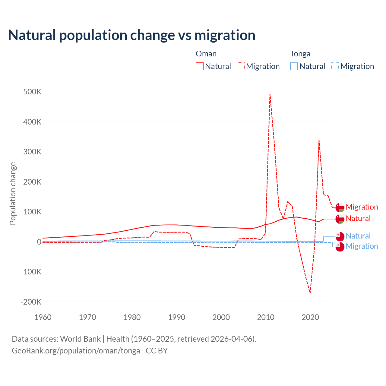Over the last 10 years, 61.6% of the population change in Oman is from natural causes (a gain of 763,049 people) and 38.4% is from migration (a gain of 475,565 people). In Tonga 46.9% is from natural causes (a gain of 18,919 people) and 53.1% is from migration (a loss of 21,384 people).