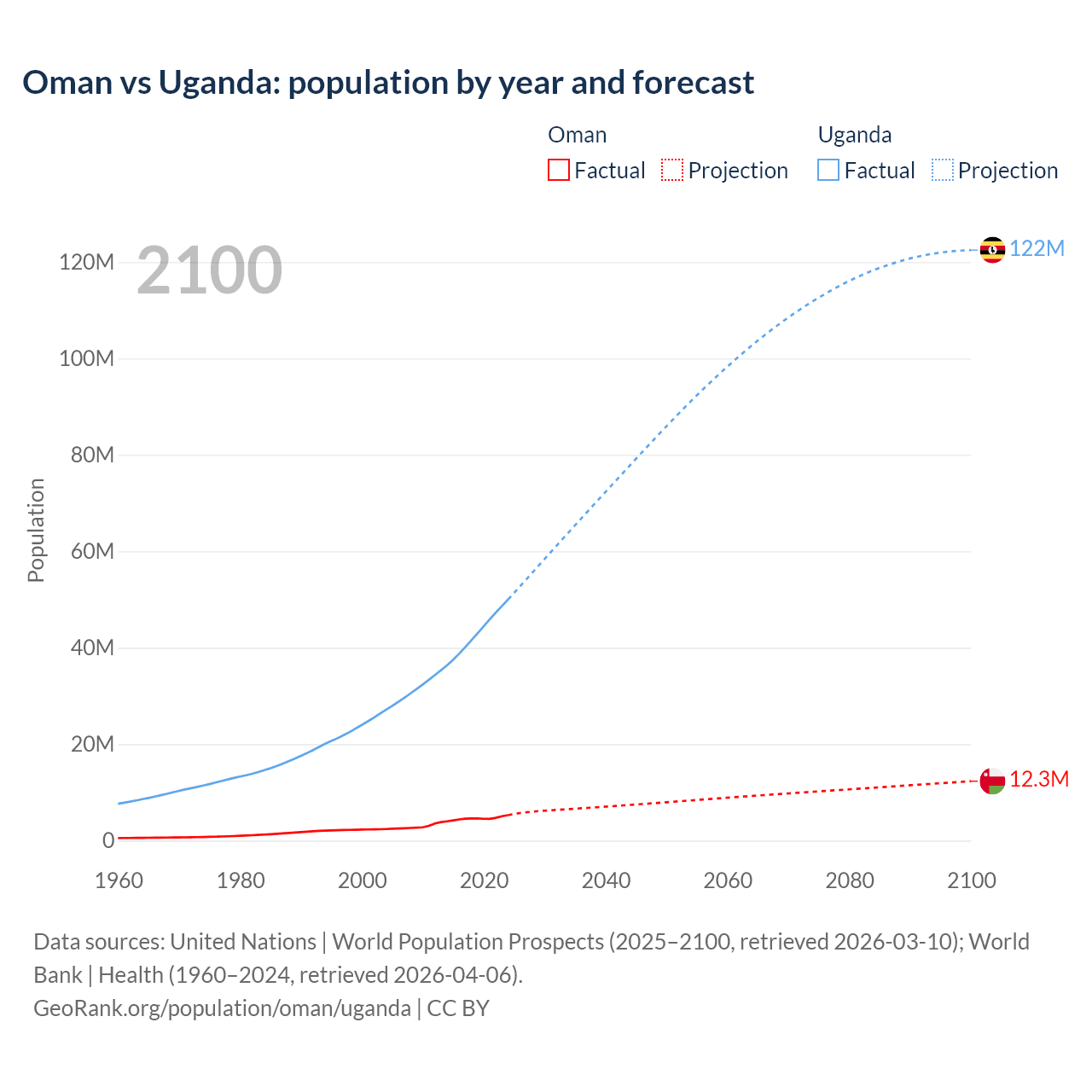 - For the last 10 years, Oman has had an average growth rate of +2.99% per year vs +3.21% in Uganda.