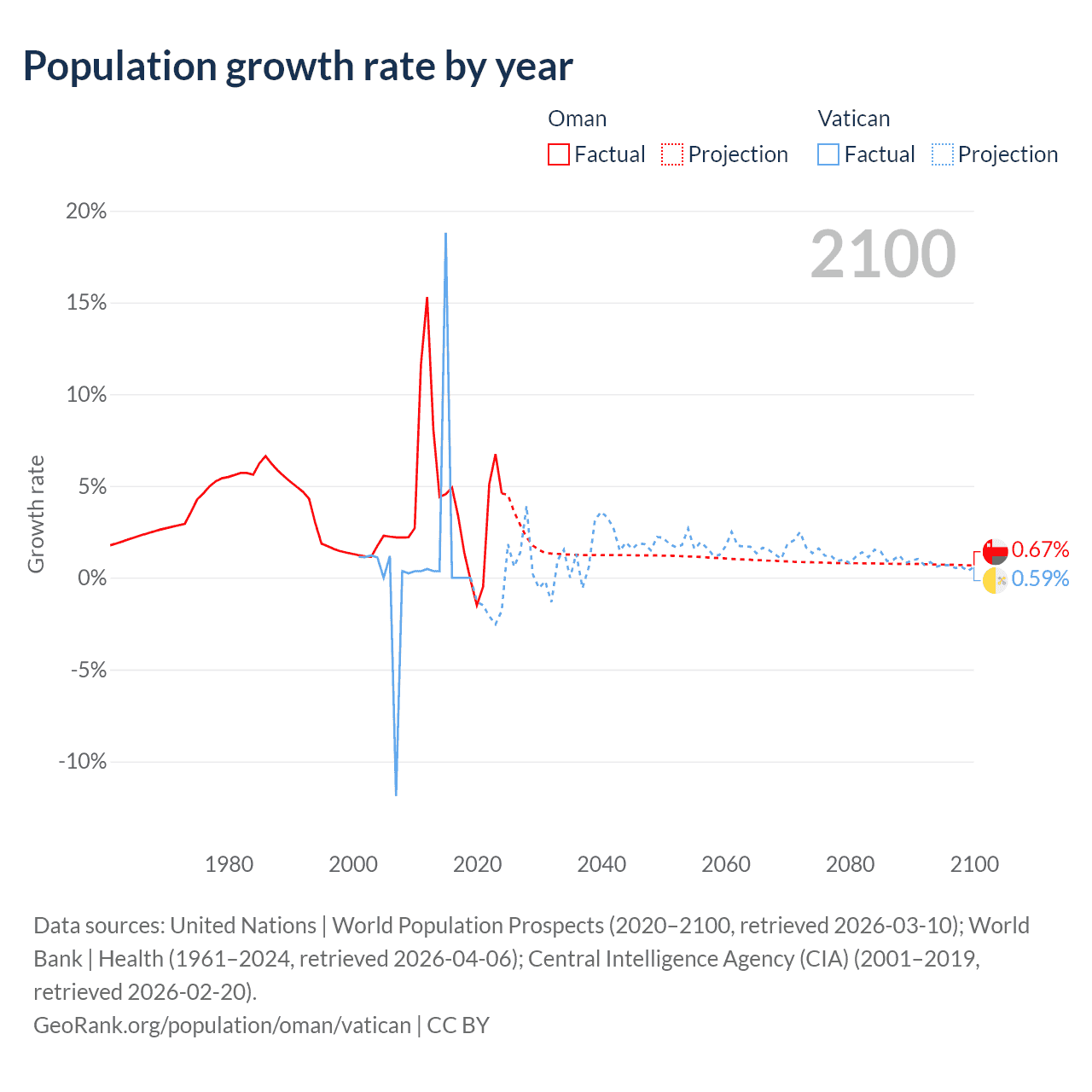 - For the last 10 years, Oman has had an average growth rate of +2.99% per year vs +1.9% in the Vatican.
