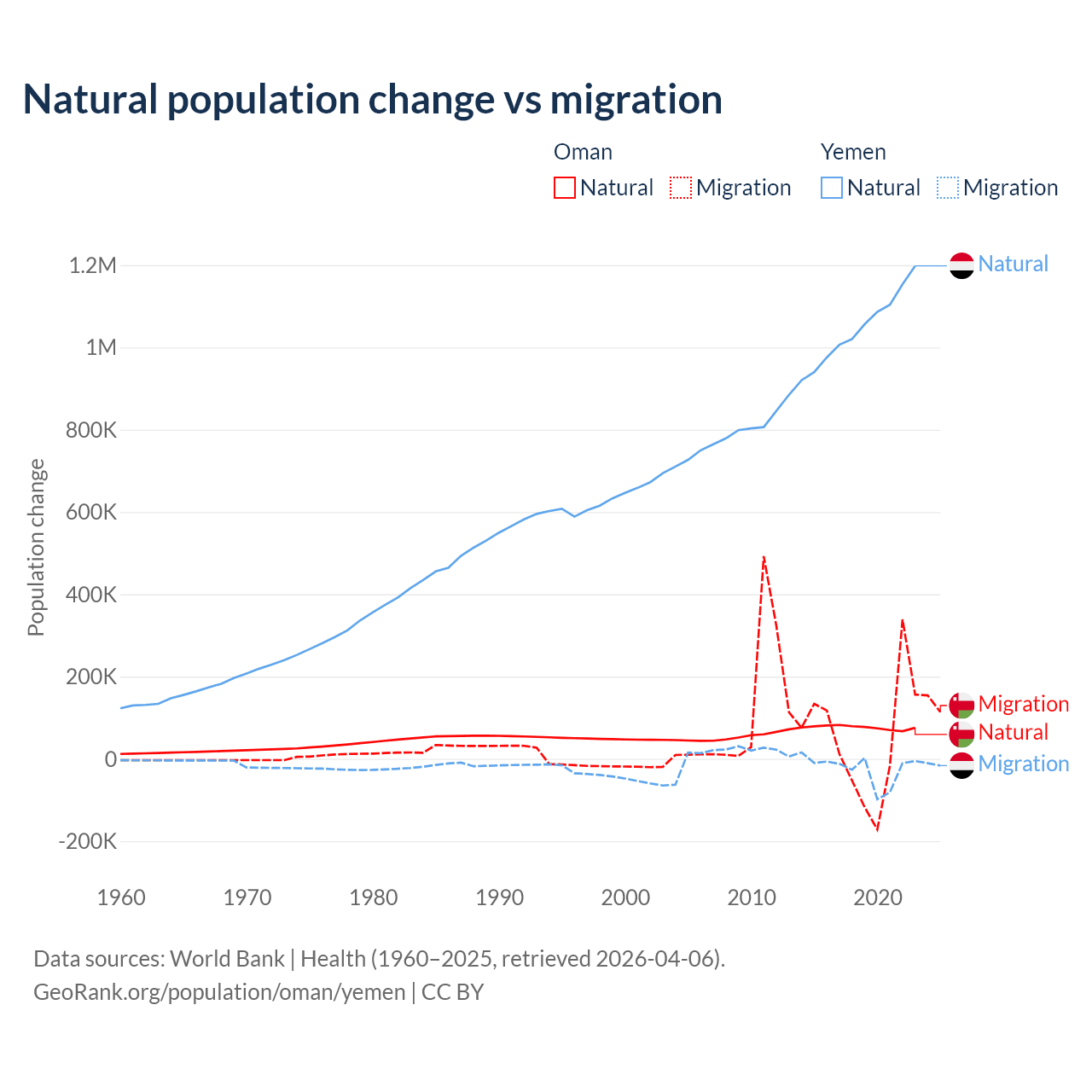 Over the last 10 years, 61.6% of the population change in Oman is from natural causes (a gain of 763,049 people) and 38.4% is from migration (a gain of 475,565 people). In Yemen 97.8% is from natural causes (a gain of 10,460,813 people) and 2.17% is from migration (a loss of 231,814 people).