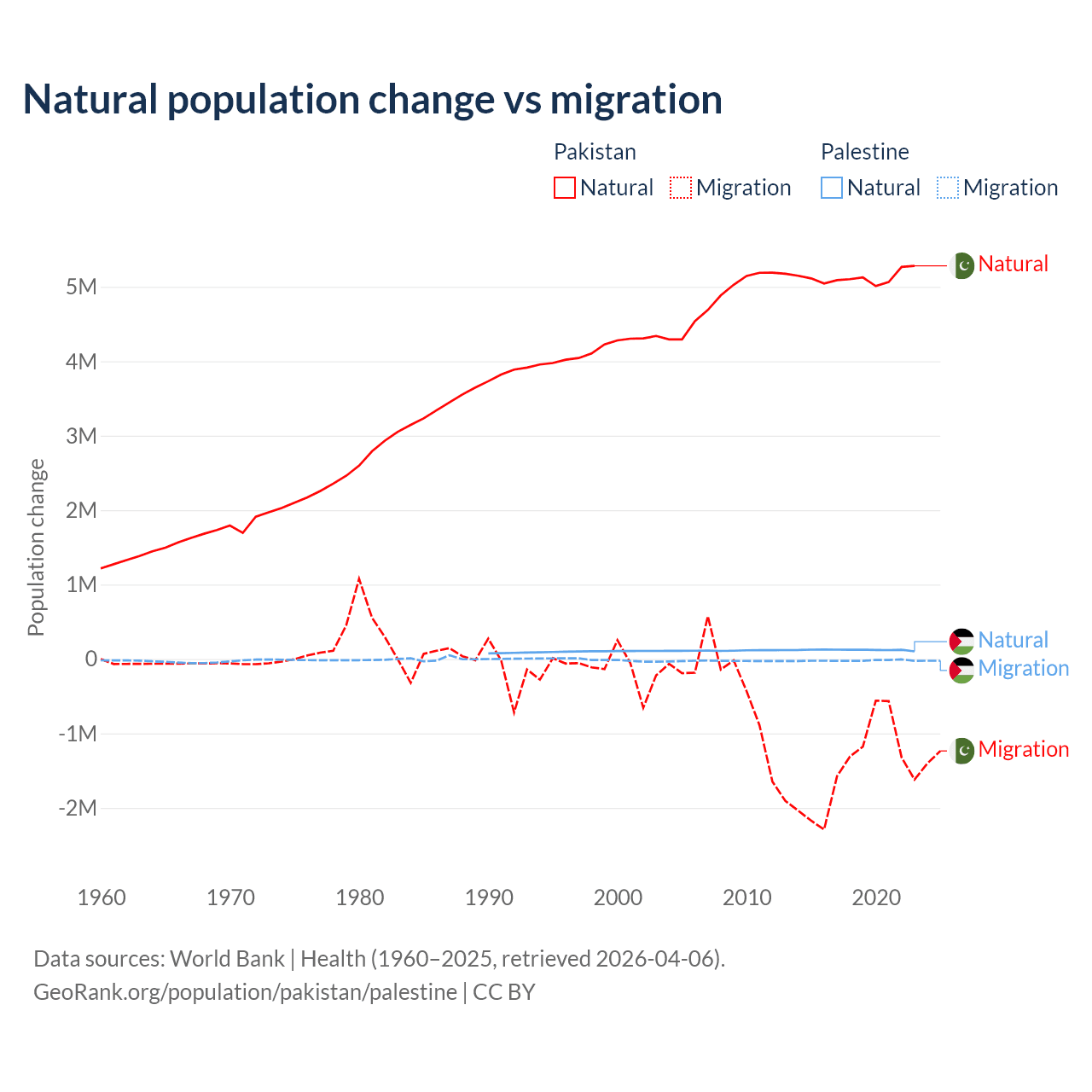 Over the last 10 years, 77.8% of the population change in Pakistan is from natural causes (a gain of 51,255,404 people) and 22.2% is from migration (a loss of 14,629,055 people). In Palestine 85.7% is from natural causes (a gain of 1,218,010 people) and 14.3% is from migration (a loss of 202,820 people).