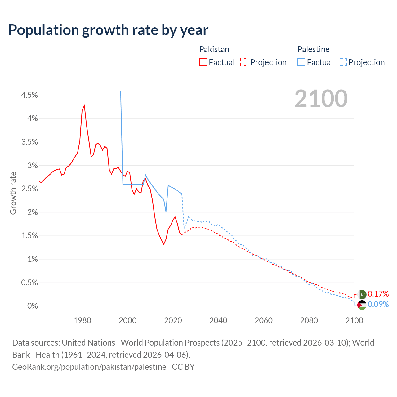- For the last 10 years, Pakistan has had an average growth rate of +1.6% per year vs +2.4% in Palestine.