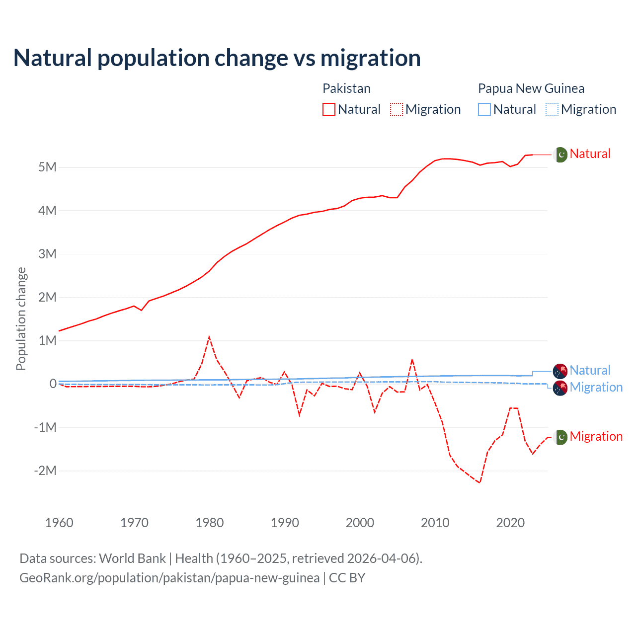Over the last 10 years, 77.8% of the population change in Pakistan is from natural causes (a gain of 51,255,404 people) and 22.2% is from migration (a loss of 14,629,055 people). In Papua New Guinea 91% is from natural causes (a gain of 1,883,906 people) and 8.98% is from migration (a gain of 185,900 people).