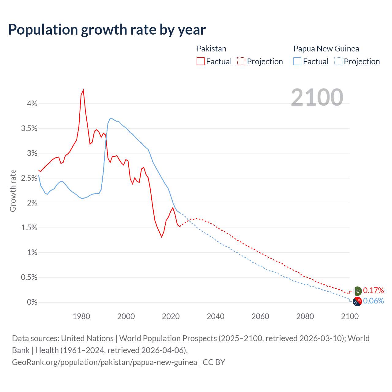 - For the last 10 years, Pakistan has had an average growth rate of +1.6% per year vs +2.23% in Papua New Guinea.