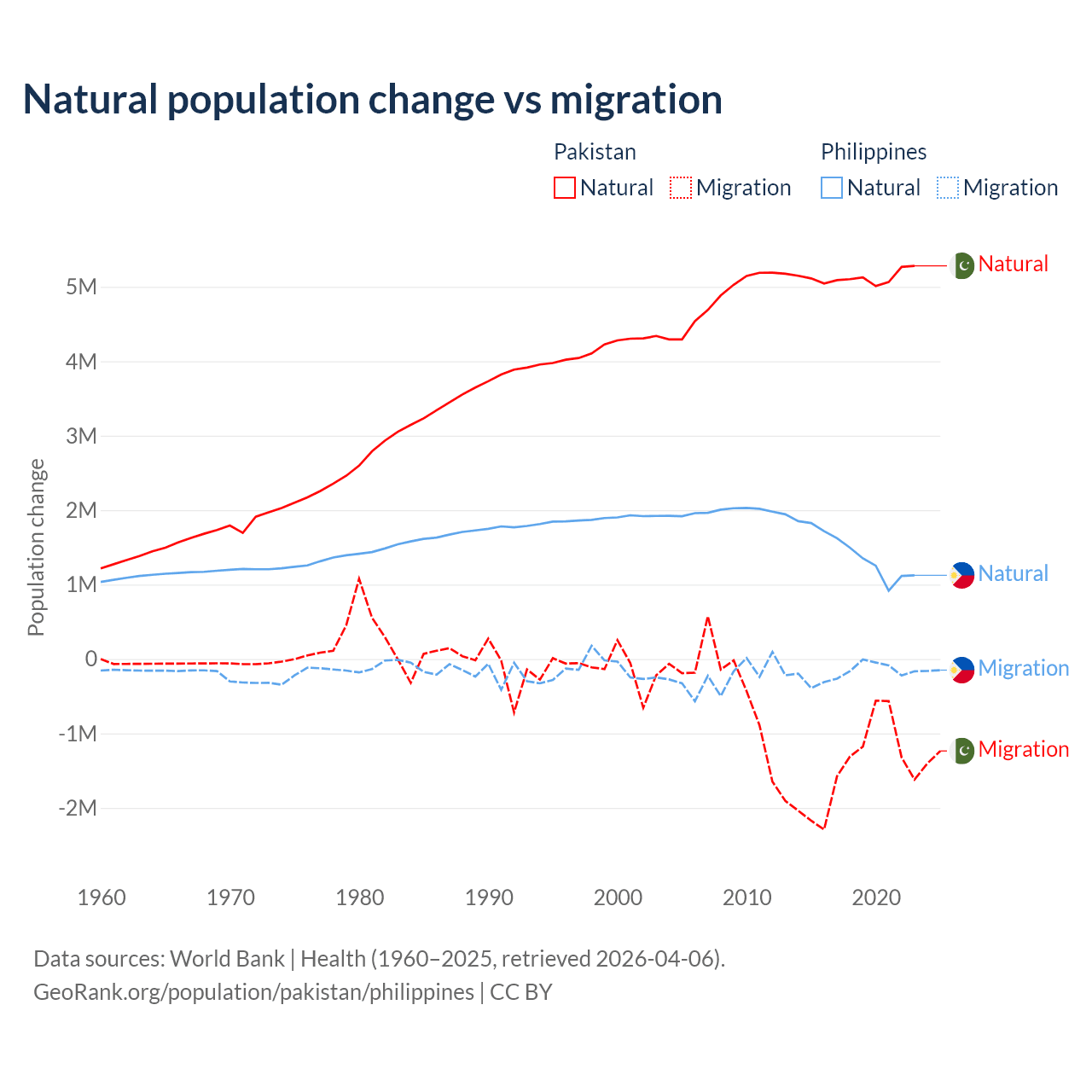 Over the last 10 years, 77.8% of the population change in Pakistan is from natural causes (a gain of 51,255,404 people) and 22.2% is from migration (a loss of 14,629,055 people). In the Philippines 88.5% is from natural causes (a gain of 14,279,705 people) and 11.5% is from migration (a loss of 1,848,117 people).