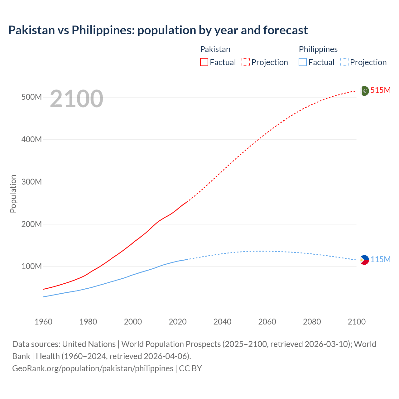 The latest officially reported population of Pakistan was 251,269,164 in 2024 vs 115,843,670 people in the Philippines in 2024. In 2026, based on the adjusted UN estimation, the current Pakistan's population is 260,356,147 people compared to 117,991,570 in the Philippines.