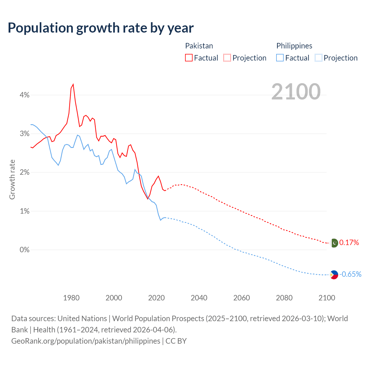- For the last 10 years, Pakistan has had an average growth rate of +1.6% per year vs +1.16% in the Philippines.