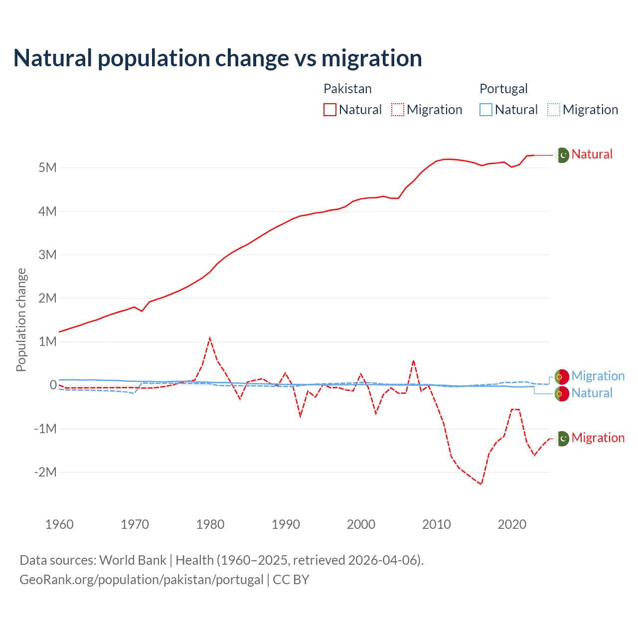 Over the last 10 years, 77.8% of the population change in Pakistan is from natural causes (a gain of 51,255,404 people) and 22.2% is from migration (a loss of 14,629,055 people). In Portugal 51% is from natural causes (a loss of 302,748 people) and 49% is from migration (a gain of 290,554 people).