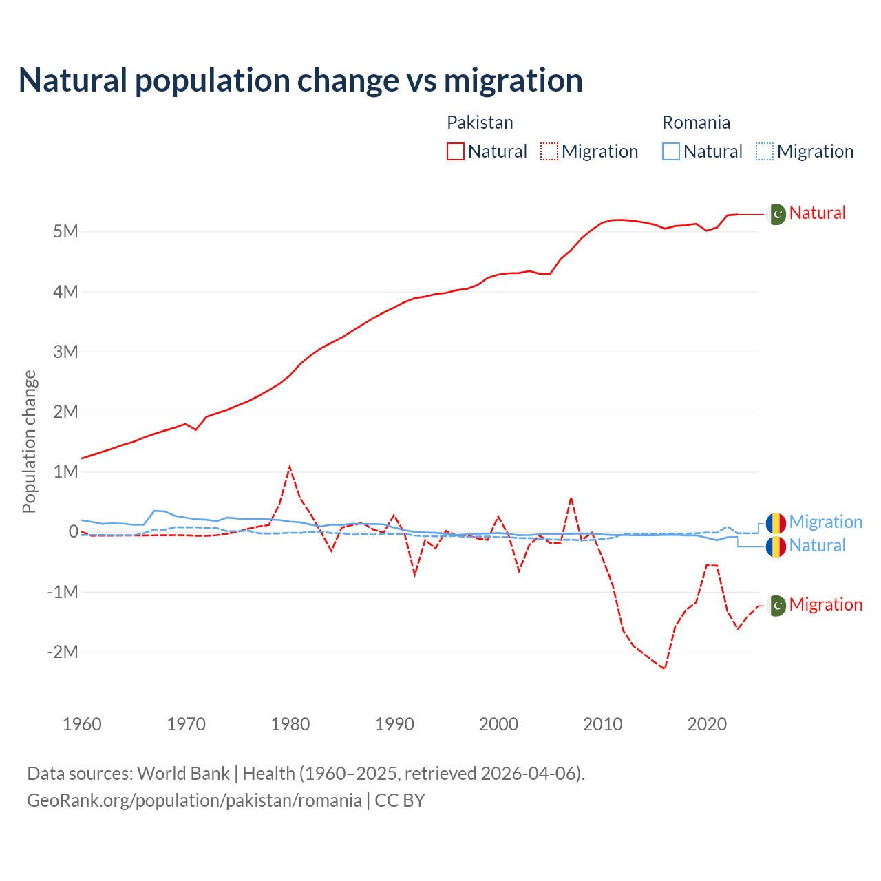 Over the last 10 years, 77.8% of the population change in Pakistan is from natural causes (a gain of 51,255,404 people) and 22.2% is from migration (a loss of 14,629,055 people). In Romania 82% is from natural causes (a loss of 766,295 people) and 18% is from migration (a loss of 167,917 people).