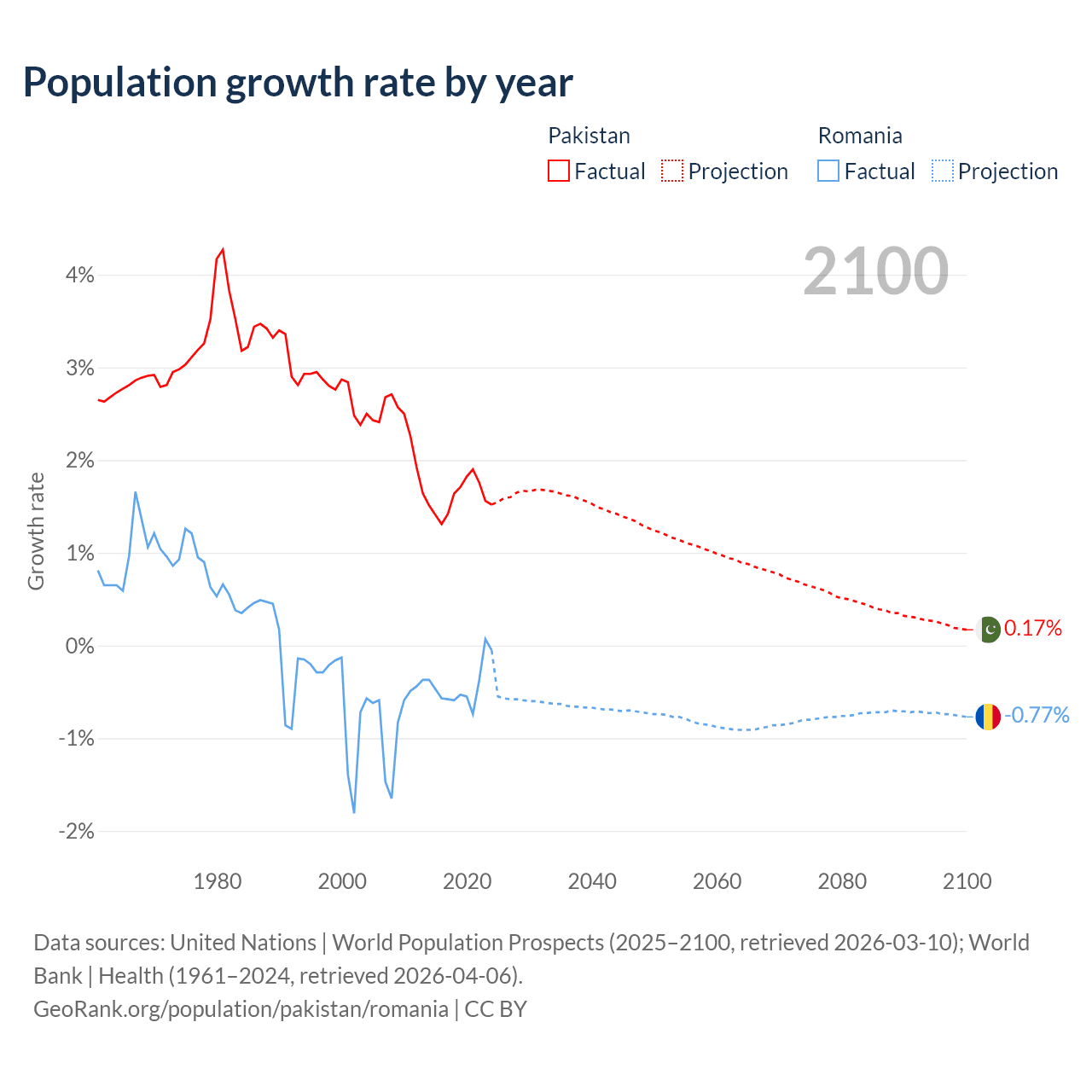 - For the last 10 years, Pakistan has had an average growth rate of +1.6% per year vs -0.43% in Romania.