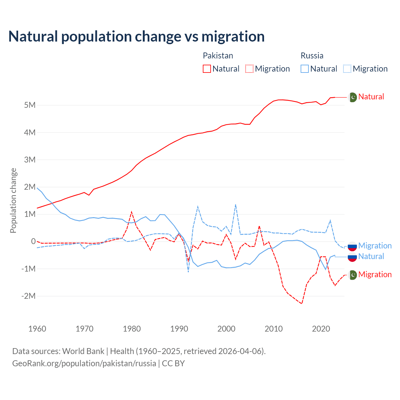 Over the last 10 years, 77.8% of the population change in Pakistan is from natural causes (a gain of 51,255,404 people) and 22.2% is from migration (a loss of 14,629,055 people). In Russia 48.6% is from natural causes (a loss of 3,416,377 people) and 51.4% is from migration (a gain of 3,611,826 people).