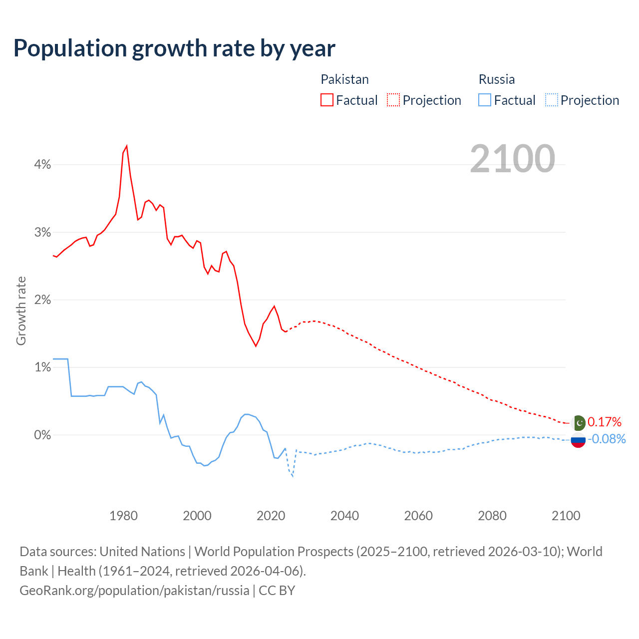- For the last 10 years, Pakistan has had an average growth rate of +1.6% per year vs -0.02% in Russia.