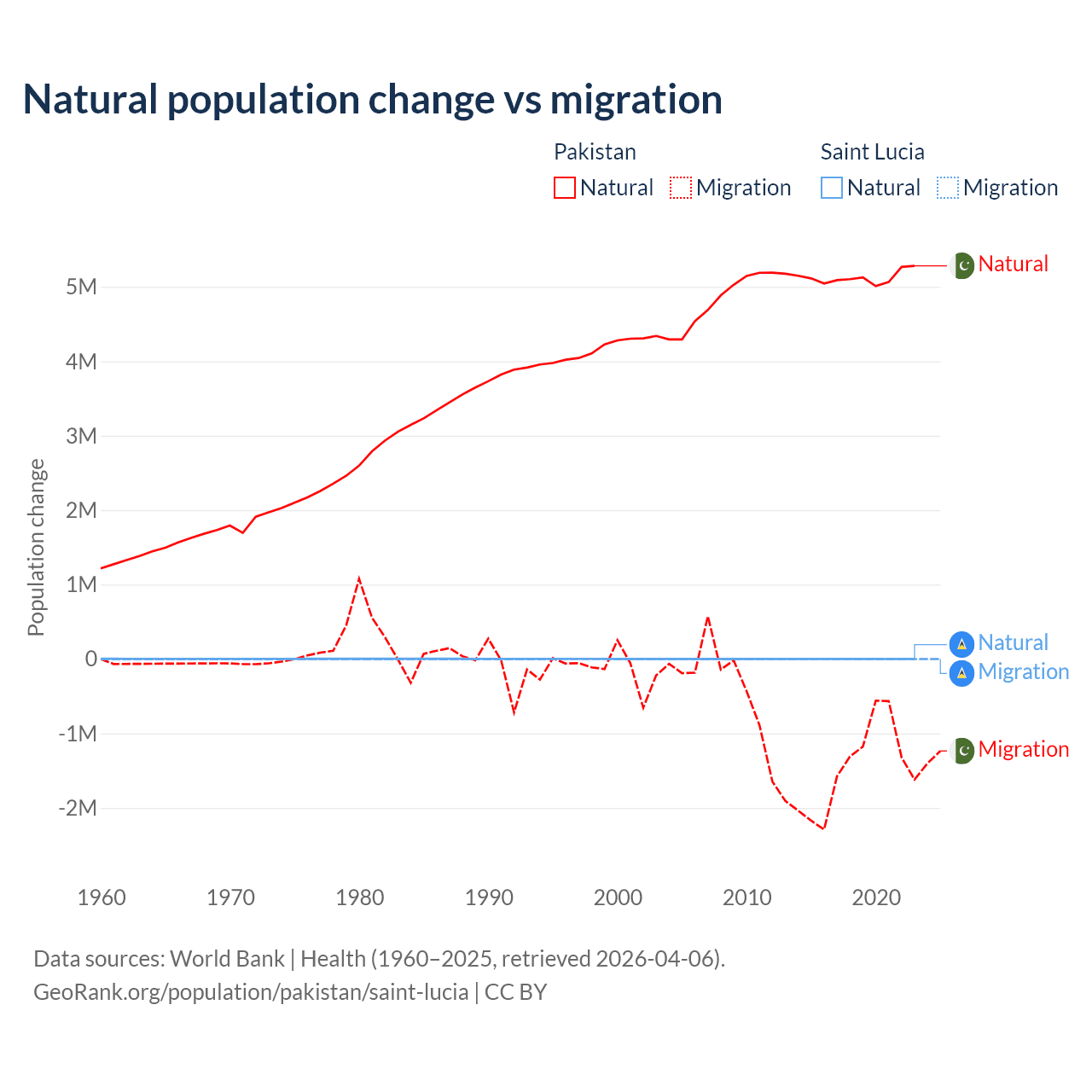 Over the last 10 years, 77.8% of the population change in Pakistan is from natural causes (a gain of 51,255,404 people) and 22.2% is from migration (a loss of 14,629,055 people). In Saint Lucia 95.7% is from natural causes (a gain of 6,039 people) and 4.31% is from migration (a loss of 272 people).