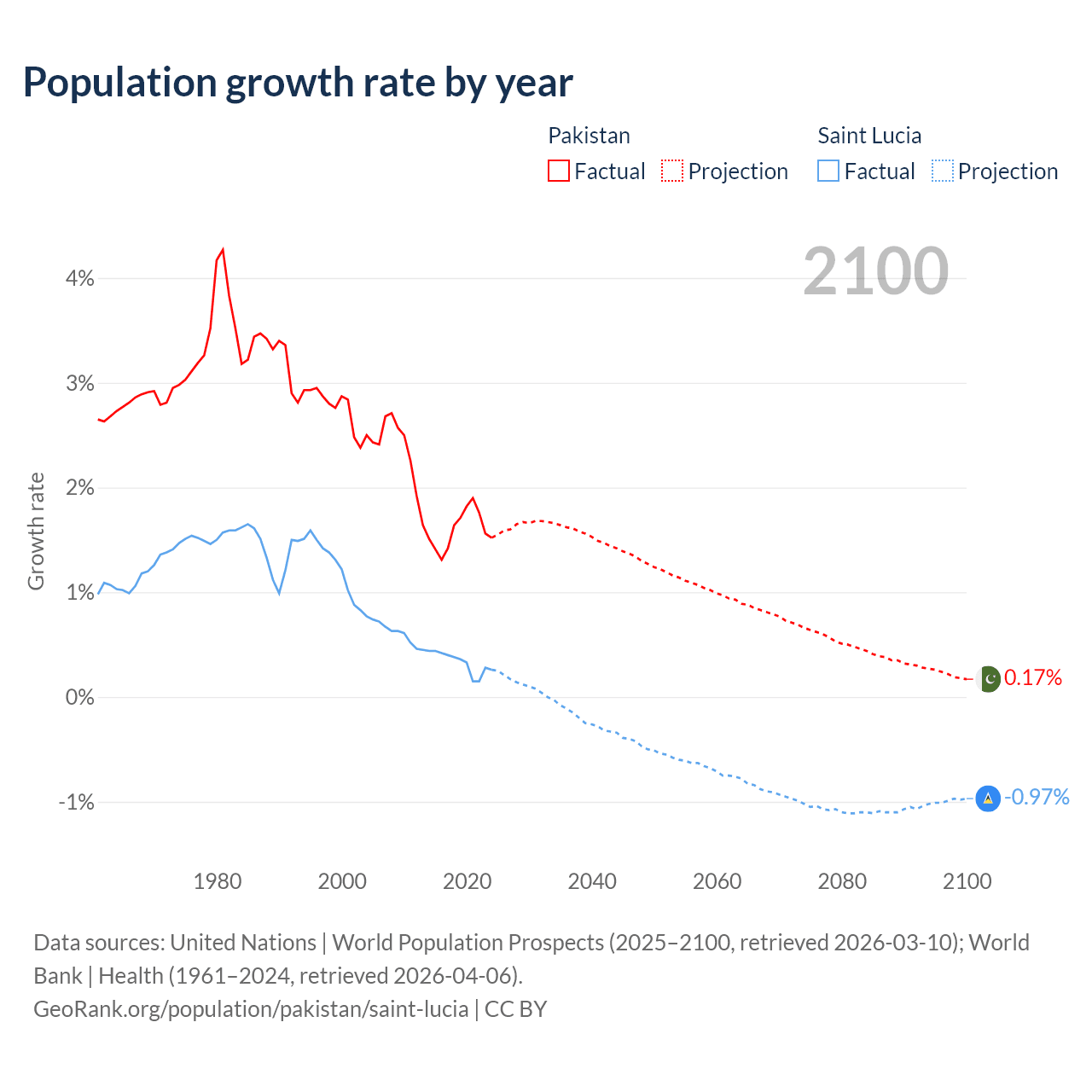 - For the last 10 years, Pakistan has had an average growth rate of +1.6% per year vs +0.33% in Saint Lucia.