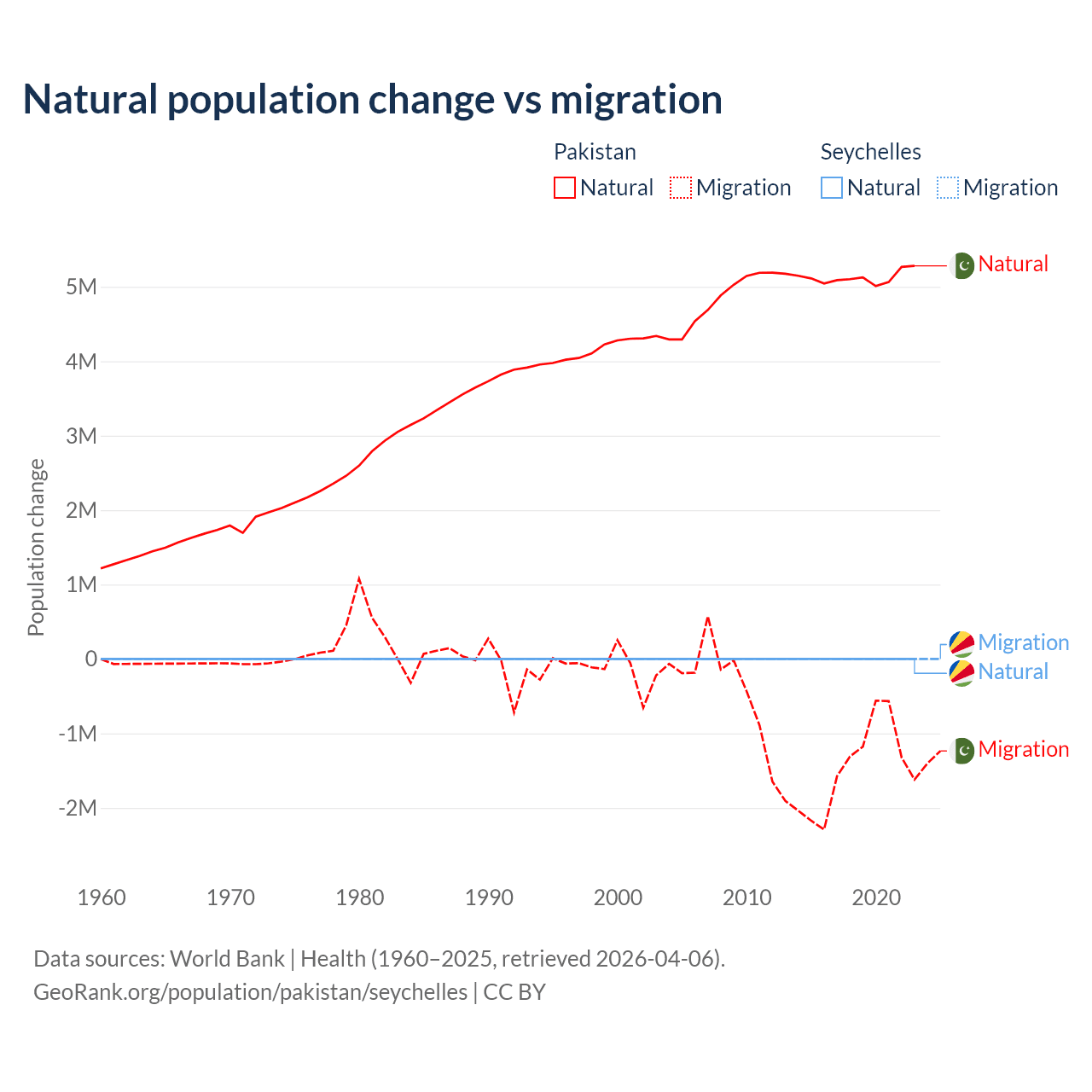 Over the last 10 years, 77.8% of the population change in Pakistan is from natural causes (a gain of 51,255,404 people) and 22.2% is from migration (a loss of 14,629,055 people). In the Seychelles 31.4% is from natural causes (a gain of 8,122 people) and 68.6% is from migration (a gain of 17,748 people).