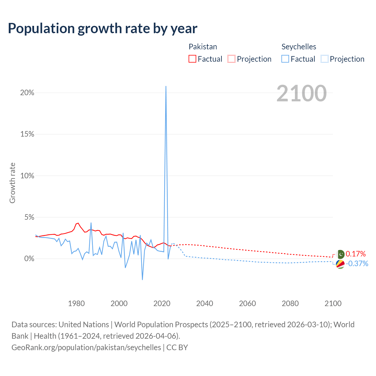 - For the last 10 years, Pakistan has had an average growth rate of +1.6% per year vs +2.9% in the Seychelles.