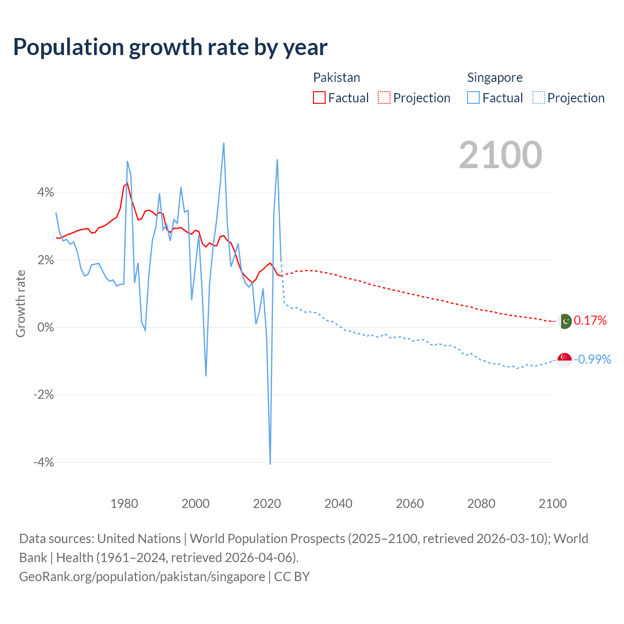 - For the last 10 years, Pakistan has had an average growth rate of +1.6% per year vs +1.04% in Singapore.