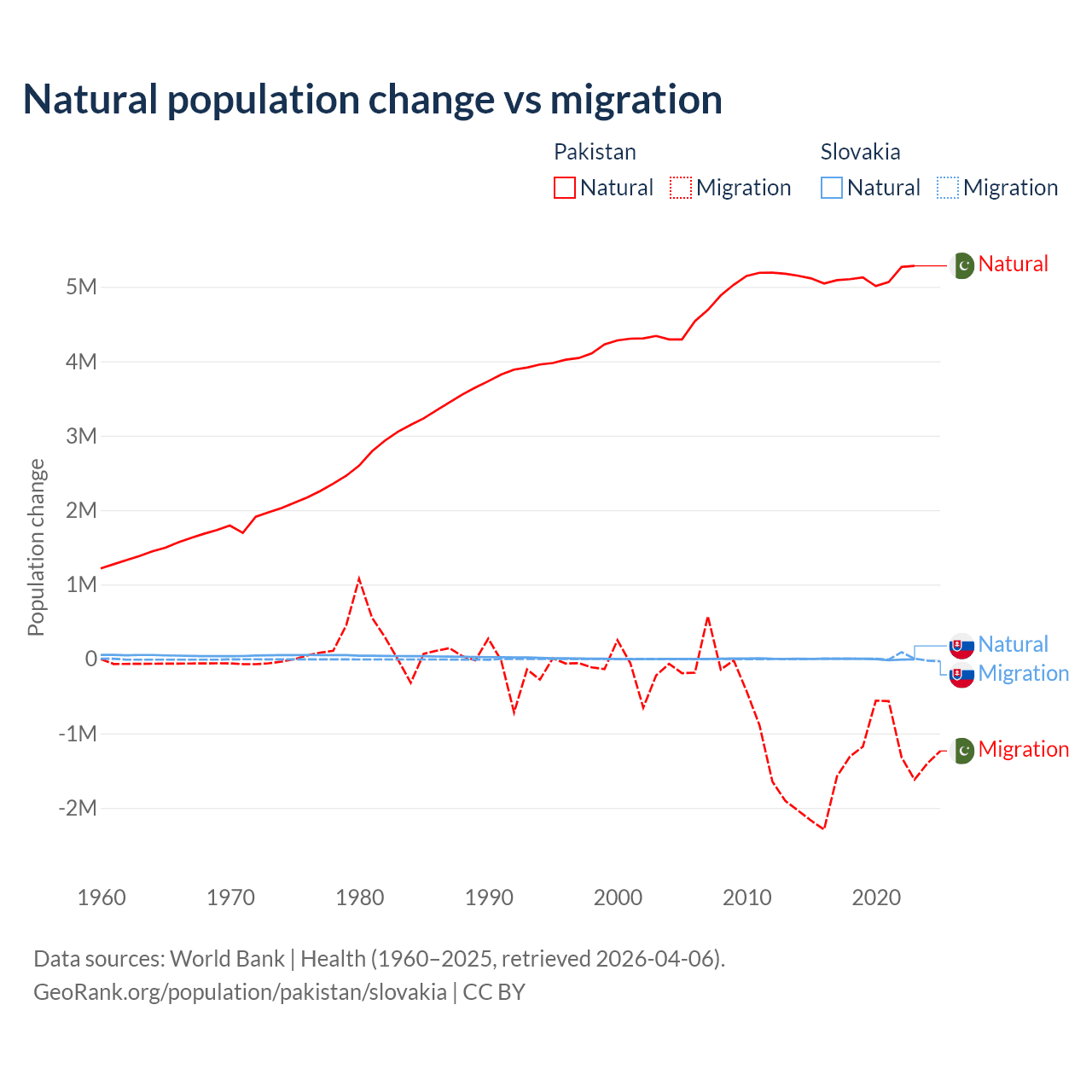 Over the last 10 years, 77.8% of the population change in Pakistan is from natural causes (a gain of 51,255,404 people) and 22.2% is from migration (a loss of 14,629,055 people). In Slovakia 7.47% is from natural causes (a loss of 8,728 people) and 92.5% is from migration (a gain of 108,156 people).