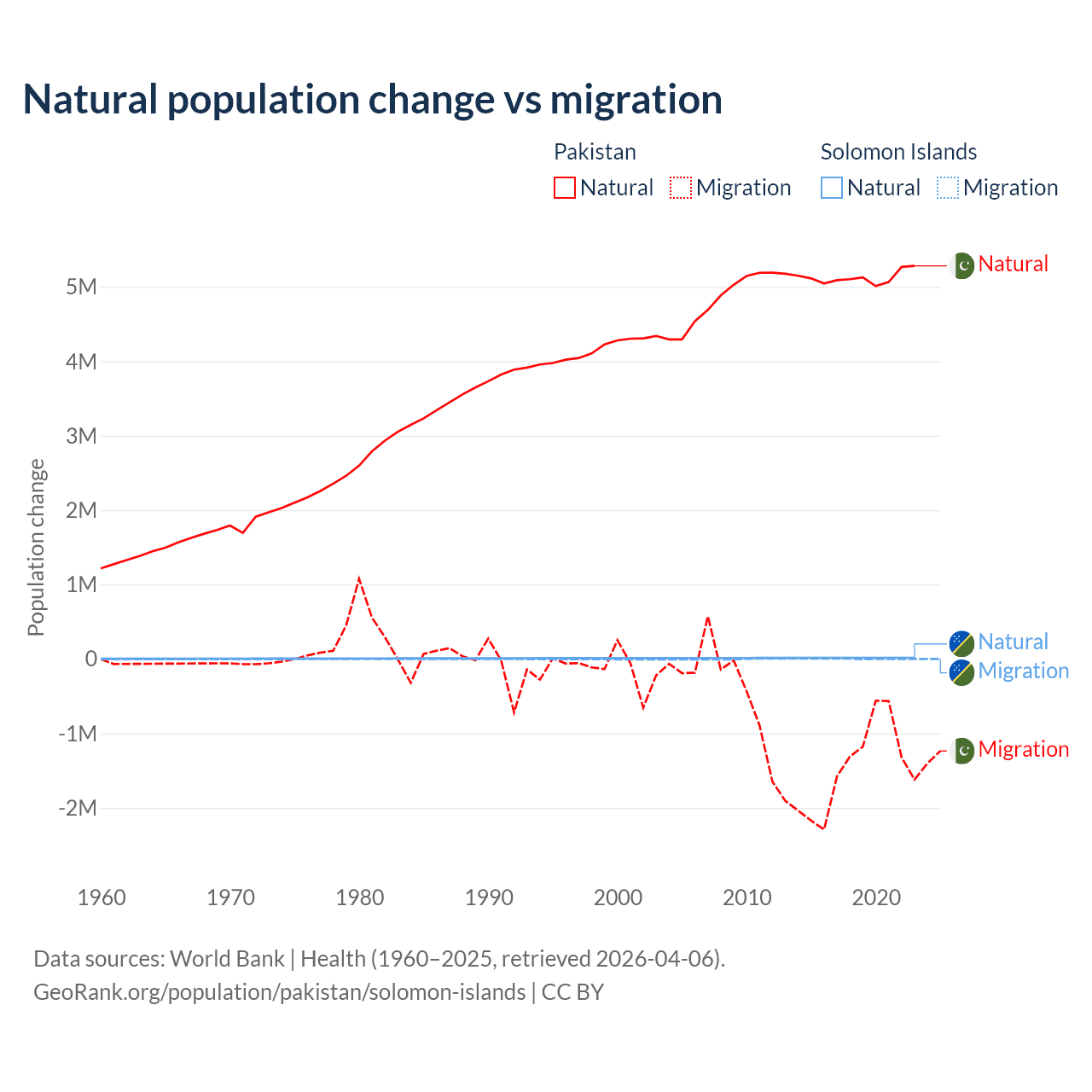 Over the last 10 years, 77.8% of the population change in Pakistan is from natural causes (a gain of 51,255,404 people) and 22.2% is from migration (a loss of 14,629,055 people). In the Solomon Islands 82.8% is from natural causes (a gain of 168,727 people) and 17.2% is from migration (a gain of 35,031 people).