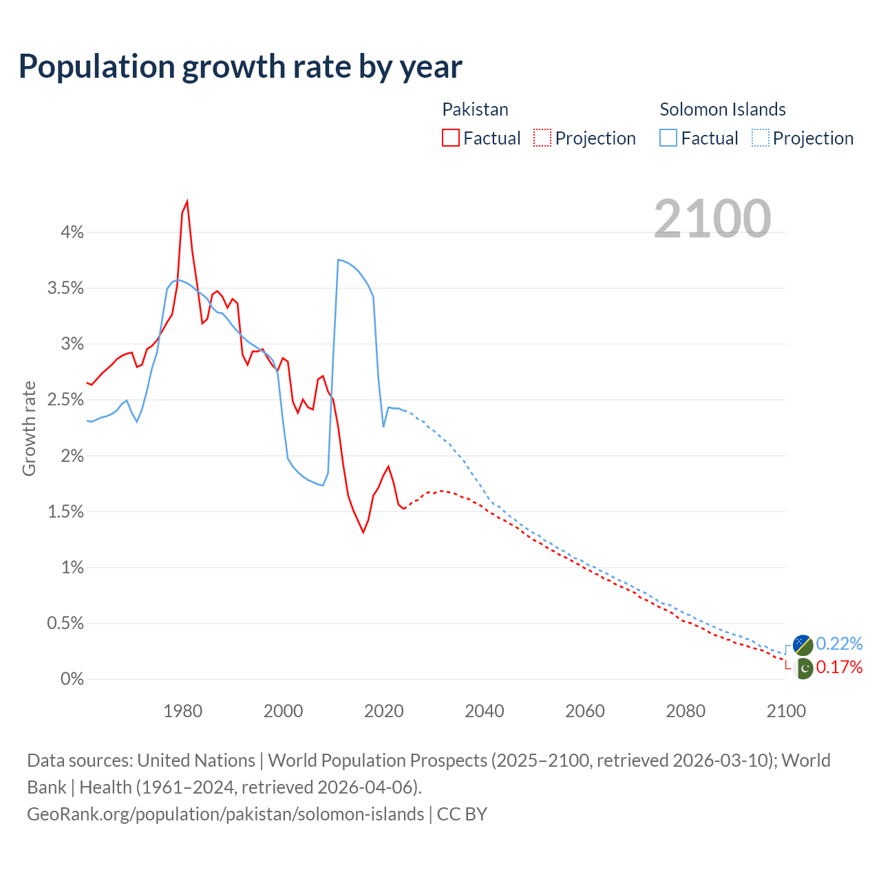 - For the last 10 years, Pakistan has had an average growth rate of +1.6% per year vs +2.95% in the Solomon Islands.