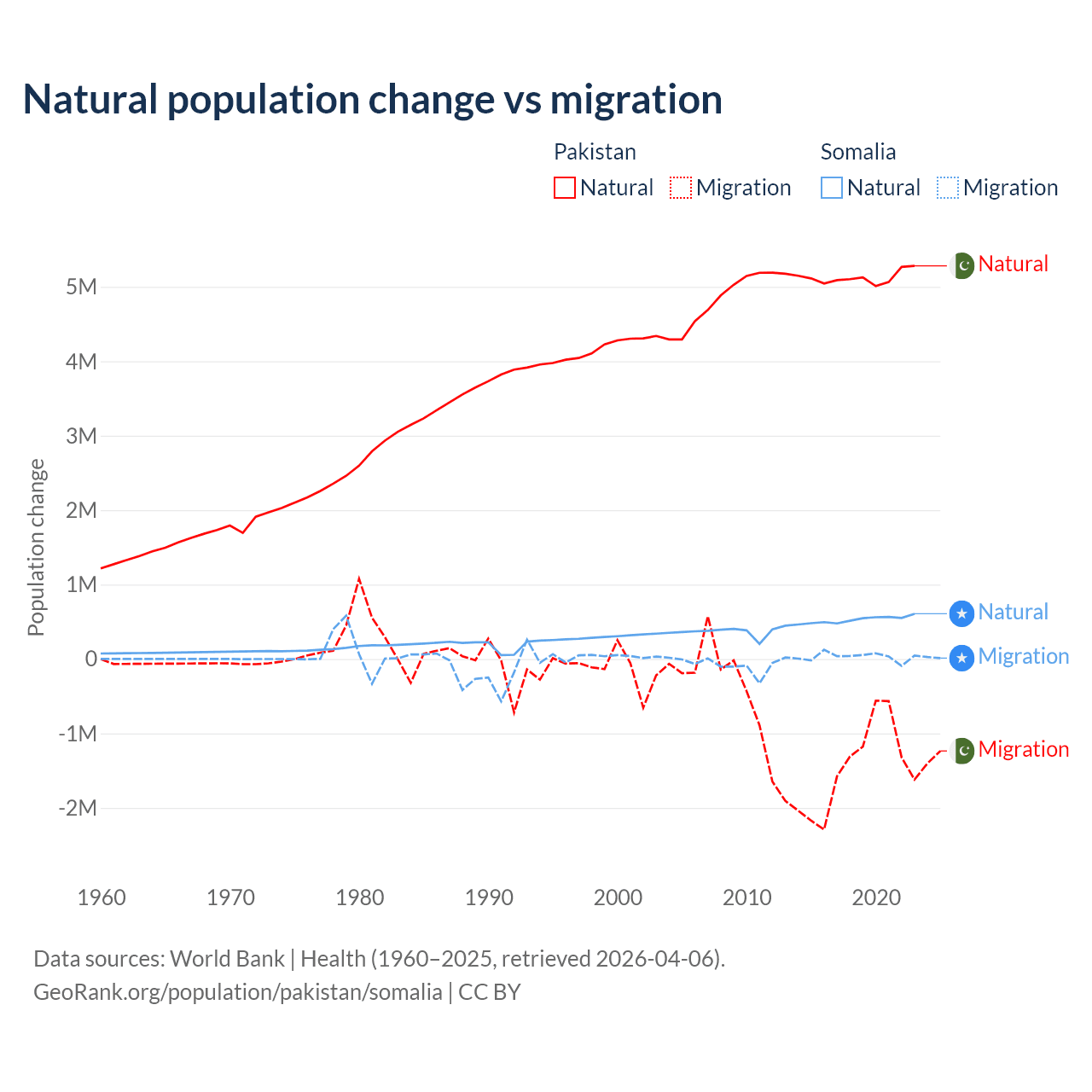 Over the last 10 years, 77.8% of the population change in Pakistan is from natural causes (a gain of 51,255,404 people) and 22.2% is from migration (a loss of 14,629,055 people). In Somalia 94.4% is from natural causes (a gain of 5,270,105 people) and 5.58% is from migration (a gain of 311,487 people).