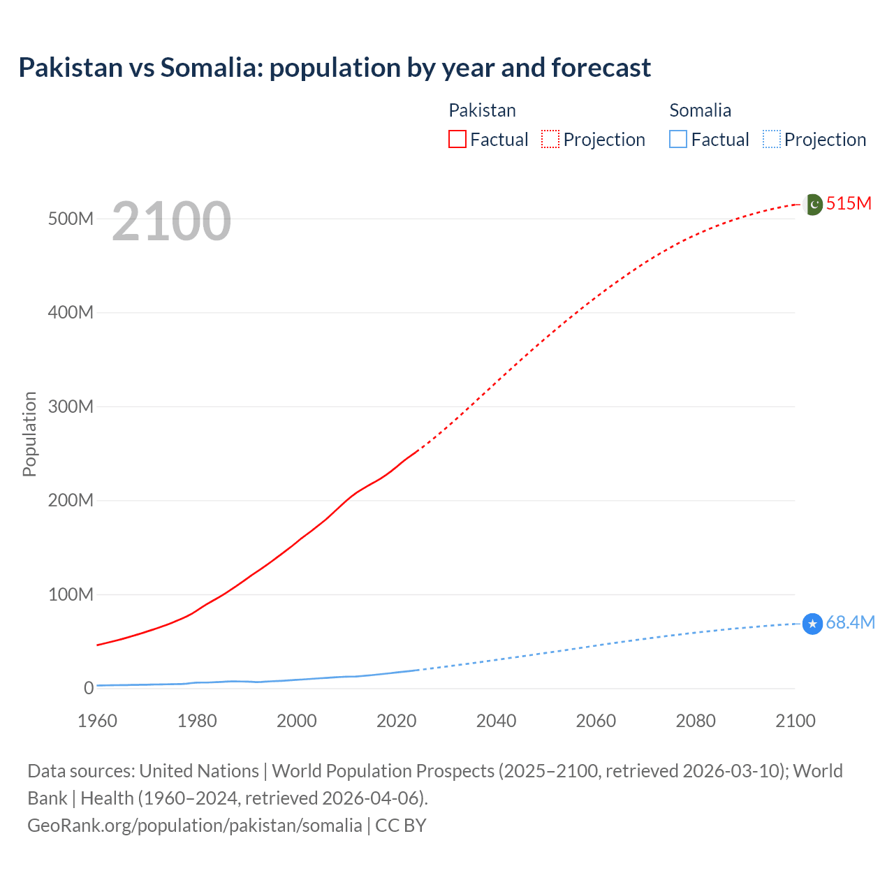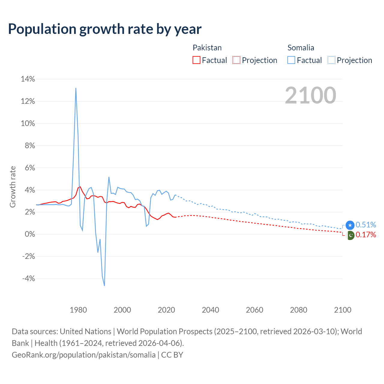 - For the last 10 years, Pakistan has had an average growth rate of +1.6% per year vs +3.61% in Somalia.