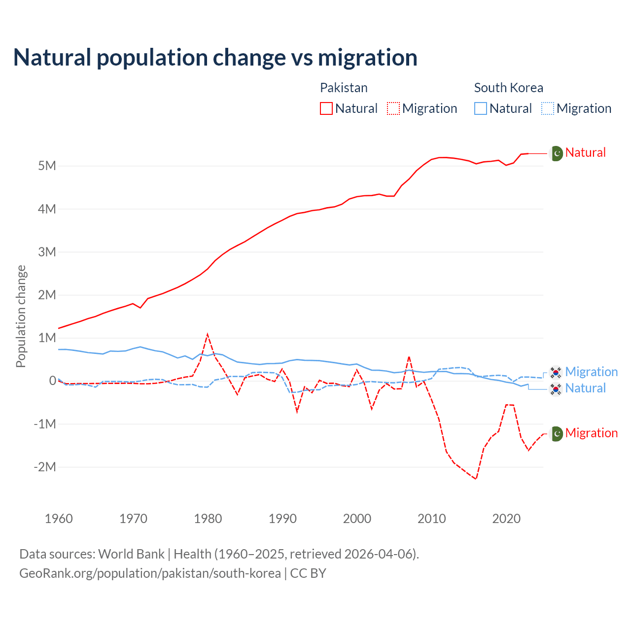 Over the last 10 years, 77.8% of the population change in Pakistan is from natural causes (a gain of 51,255,404 people) and 22.2% is from migration (a loss of 14,629,055 people). In South Korea 17.6% is from natural causes (a gain of 277,215 people) and 82.4% is from migration (a gain of 1,298,356 people).
