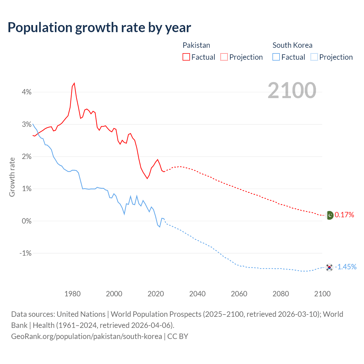 - For the last 10 years, Pakistan has had an average growth rate of +1.6% per year vs +0.24% in South Korea.
