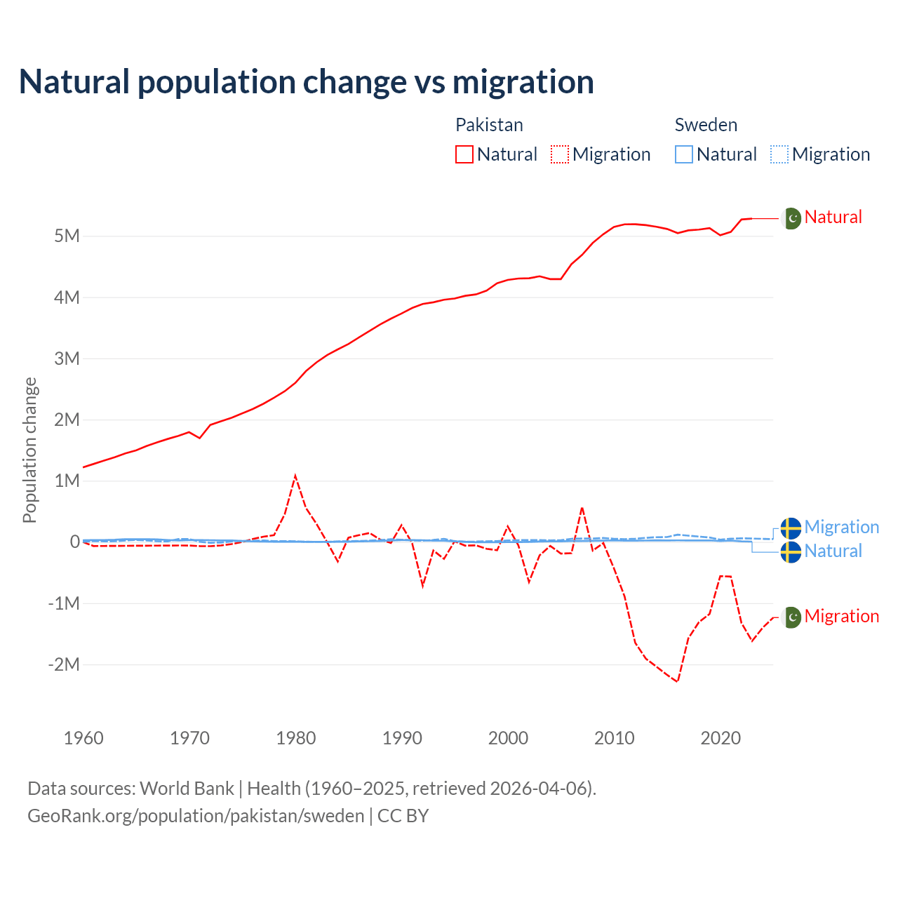 Over the last 10 years, 77.8% of the population change in Pakistan is from natural causes (a gain of 51,255,404 people) and 22.2% is from migration (a loss of 14,629,055 people). In Sweden 21.4% is from natural causes (a gain of 201,900 people) and 78.6% is from migration (a gain of 743,642 people).