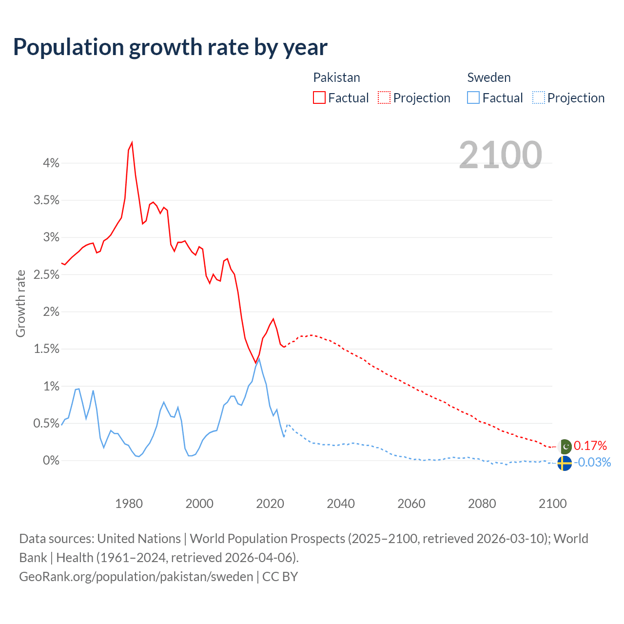 - For the last 10 years, Pakistan has had an average growth rate of +1.6% per year vs +0.88% in Sweden.