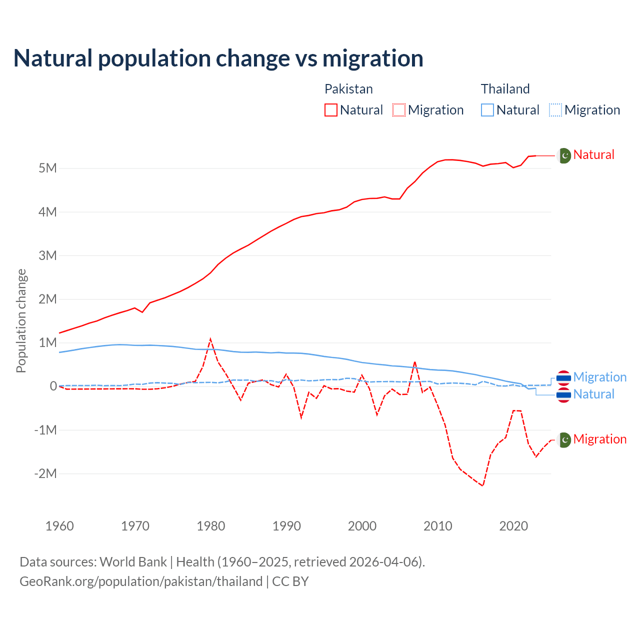 Over the last 10 years, 77.8% of the population change in Pakistan is from natural causes (a gain of 51,255,404 people) and 22.2% is from migration (a loss of 14,629,055 people). In Thailand 78.4% is from natural causes (a gain of 1,292,528 people) and 21.6% is from migration (a gain of 355,361 people).