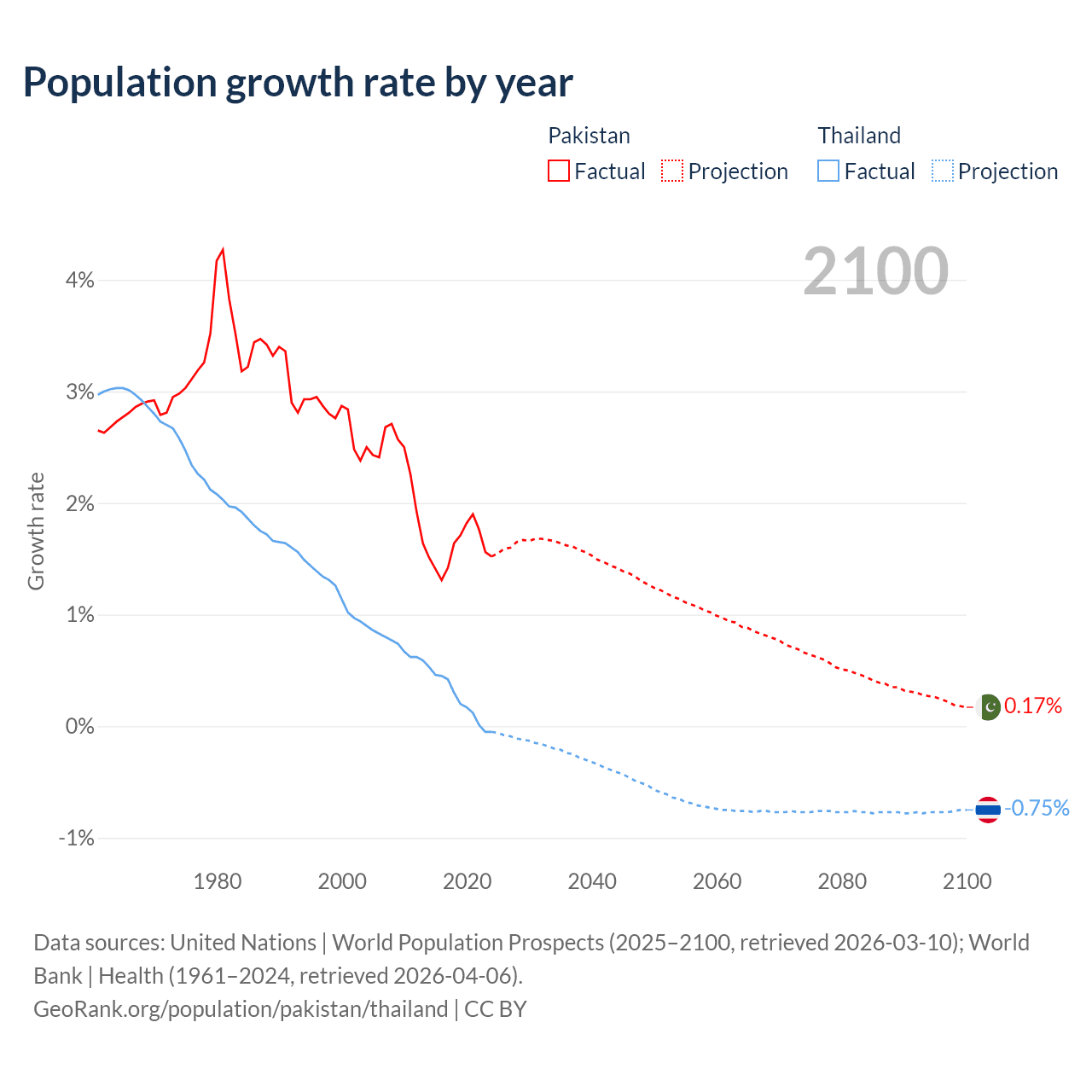 - For the last 10 years, Pakistan has had an average growth rate of +1.6% per year vs +0.23% in Thailand.