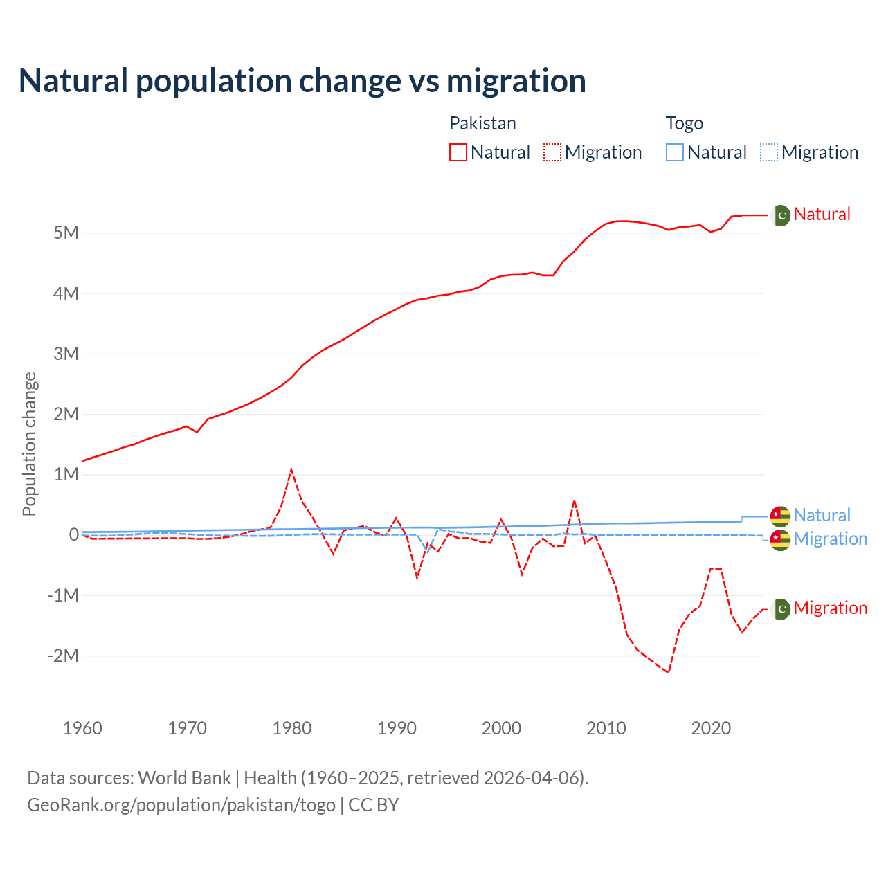 Over the last 10 years, 77.8% of the population change in Pakistan is from natural causes (a gain of 51,255,404 people) and 22.2% is from migration (a loss of 14,629,055 people). In Togo 99.1% is from natural causes (a gain of 2,052,115 people) and 0.86% is from migration (a loss of 17,852 people).