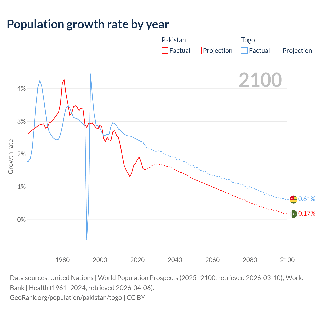 - For the last 10 years, Pakistan has had an average growth rate of +1.6% per year vs +2.46% in Togo.